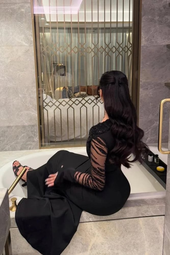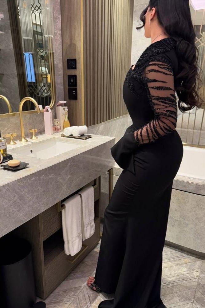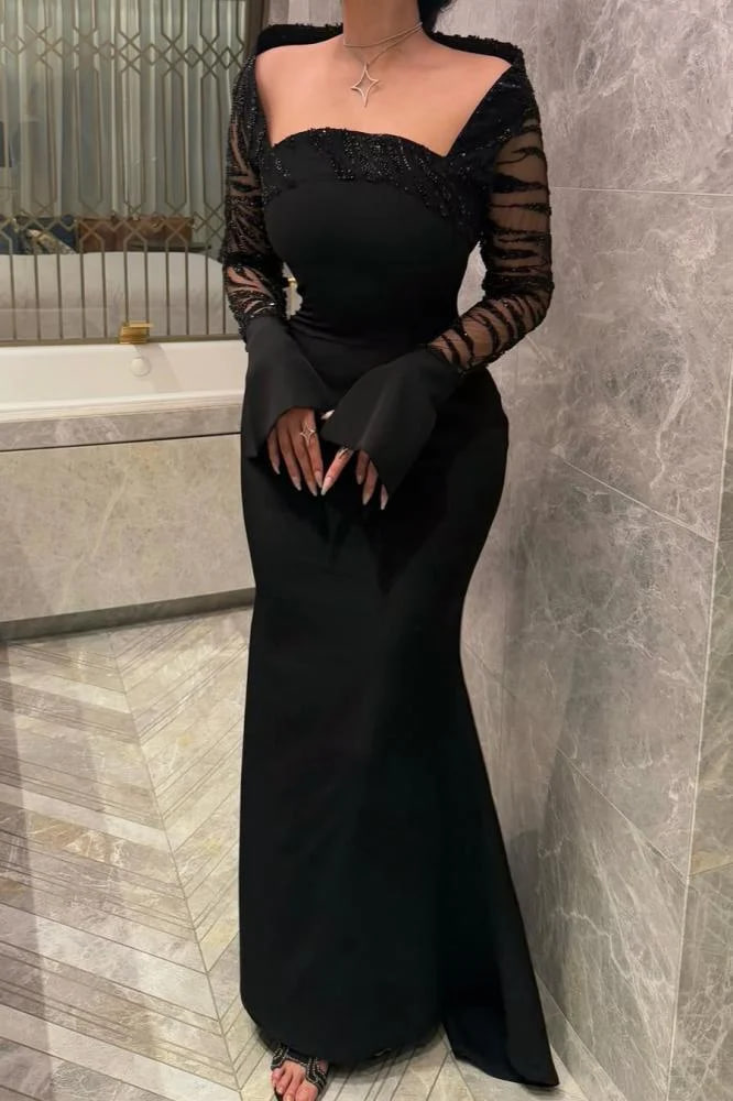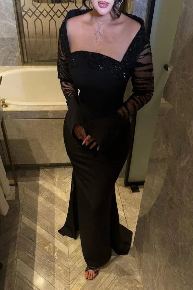 فستان سهرة أسود طويل مطرز بأكمام شفافة