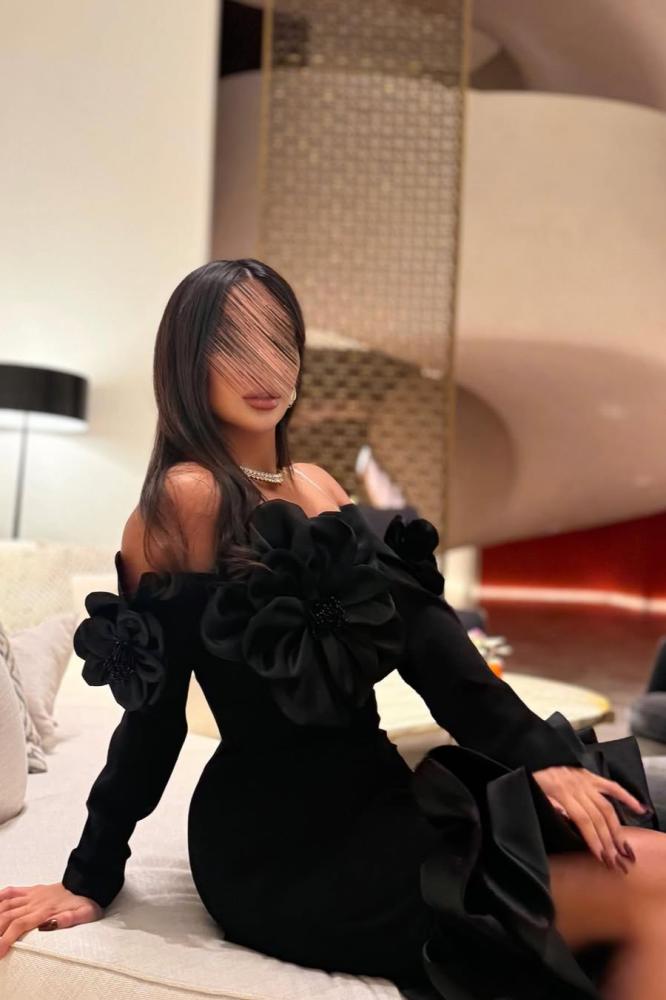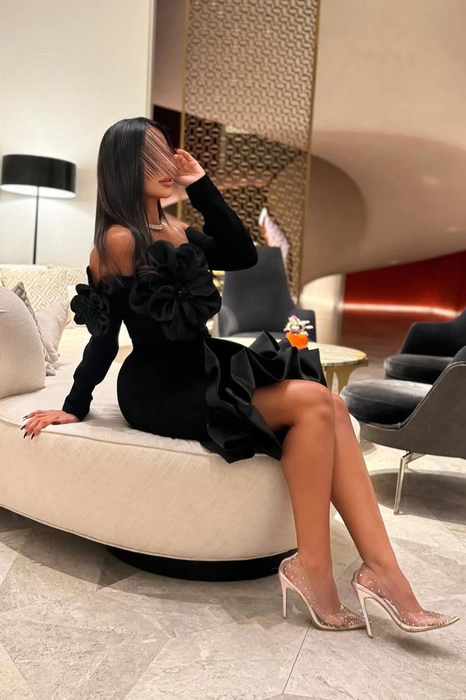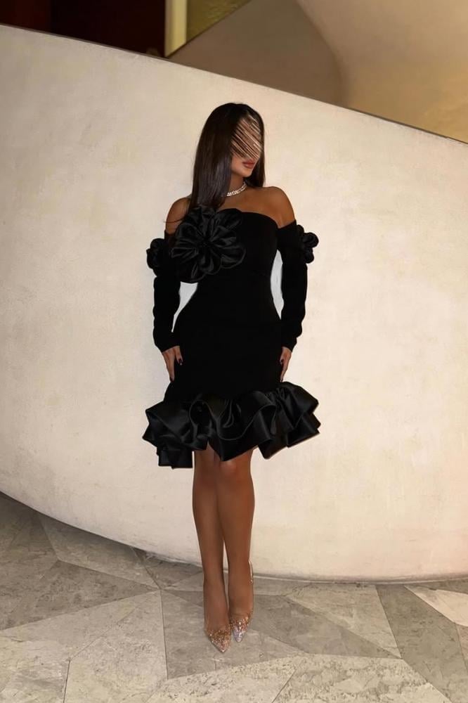 فستان أسود أنيق بقصة قصيرة وجذابة، يتميز بتصميم عصري بكتف مكشوف وتفاصيل زهرية ثلاثية الأبعاد على الكتف والتنورة لمسة فاخرة.