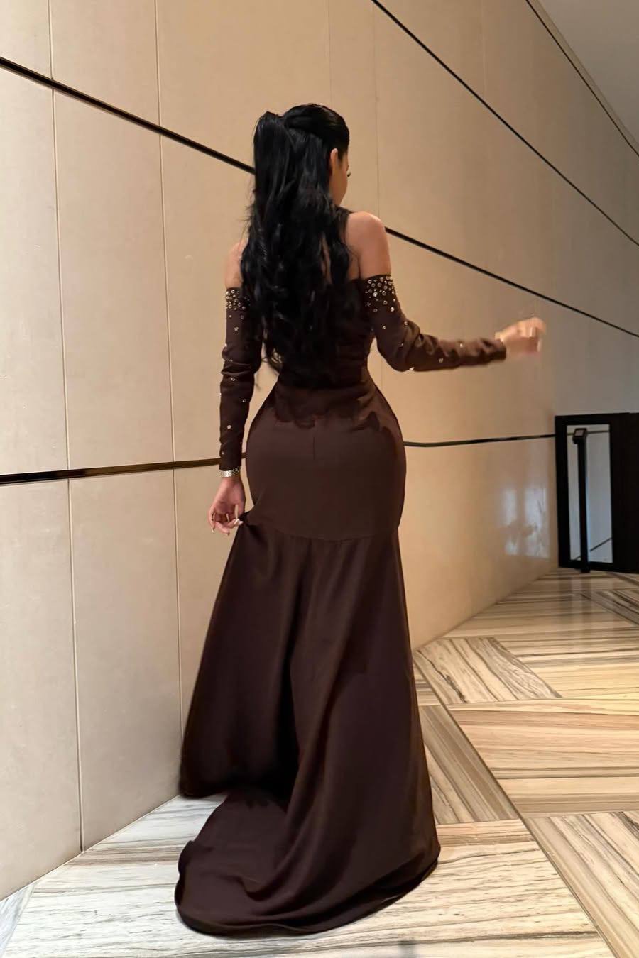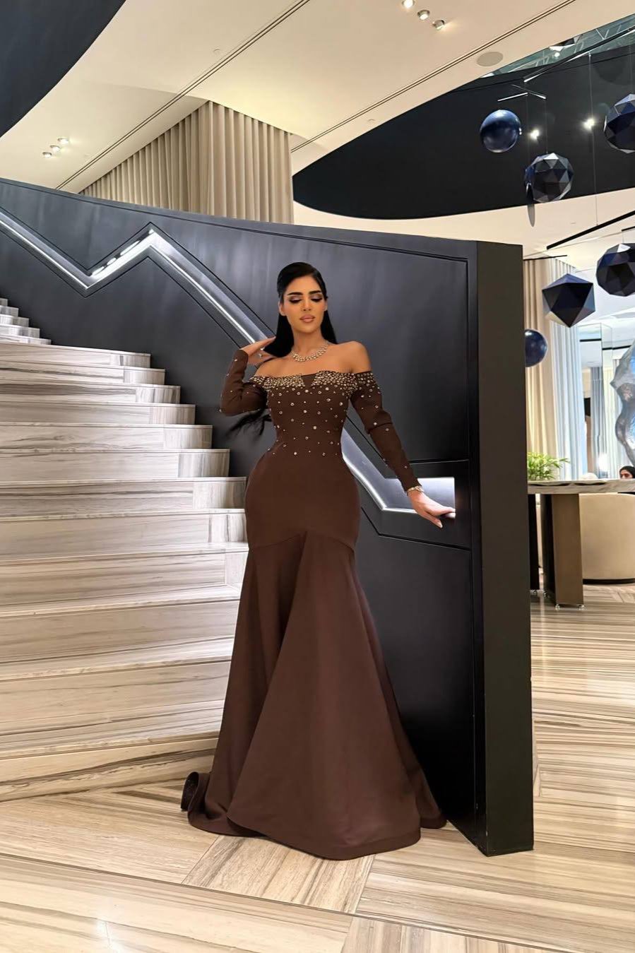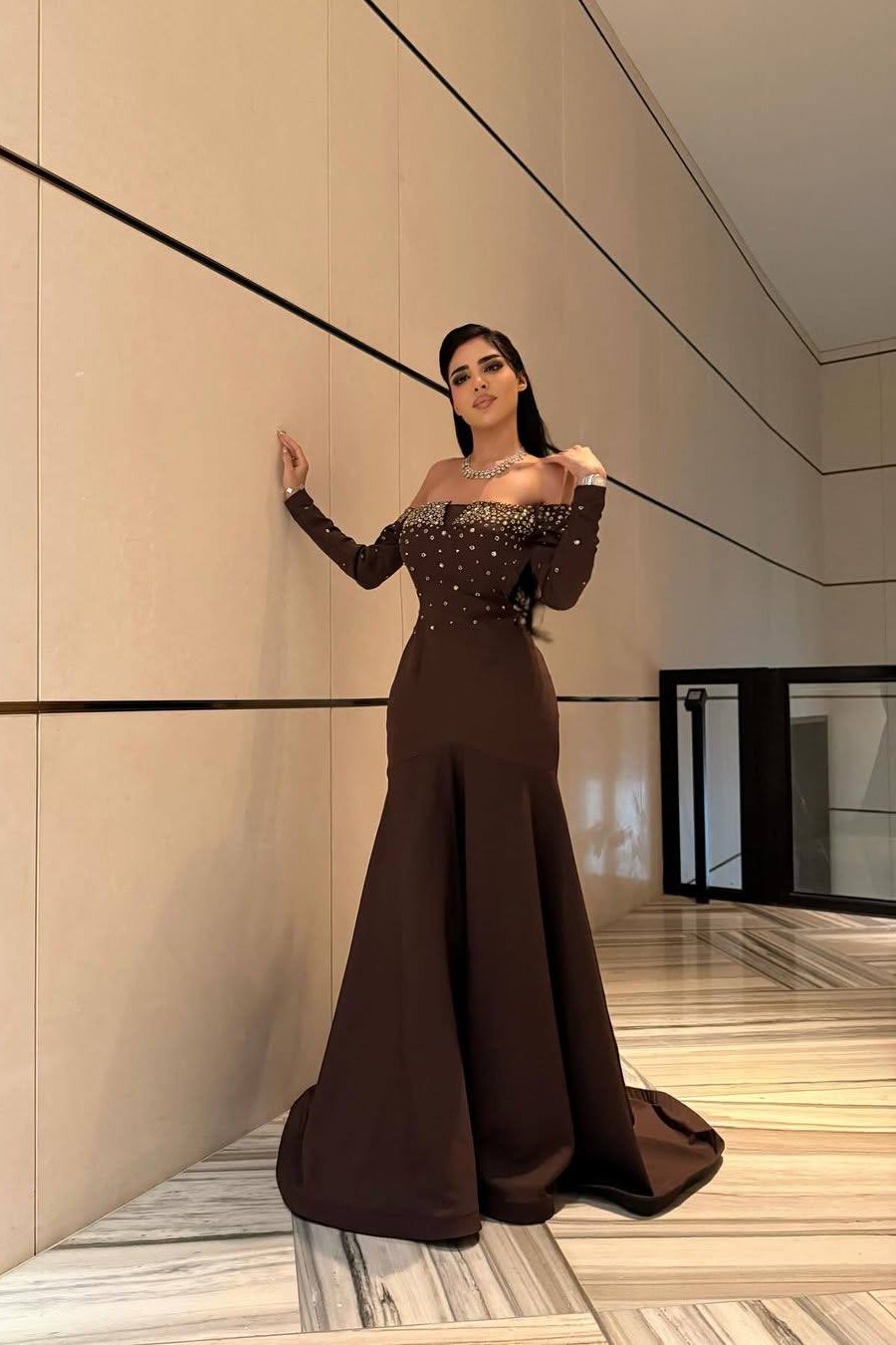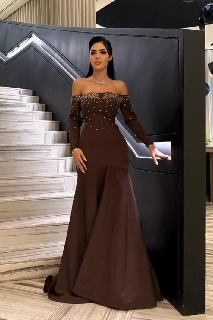 فستان سهرة بني طويل بأكتاف مكشوفة مرصع بالكريستال