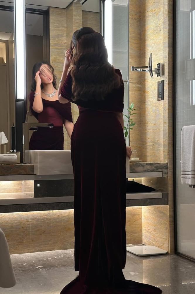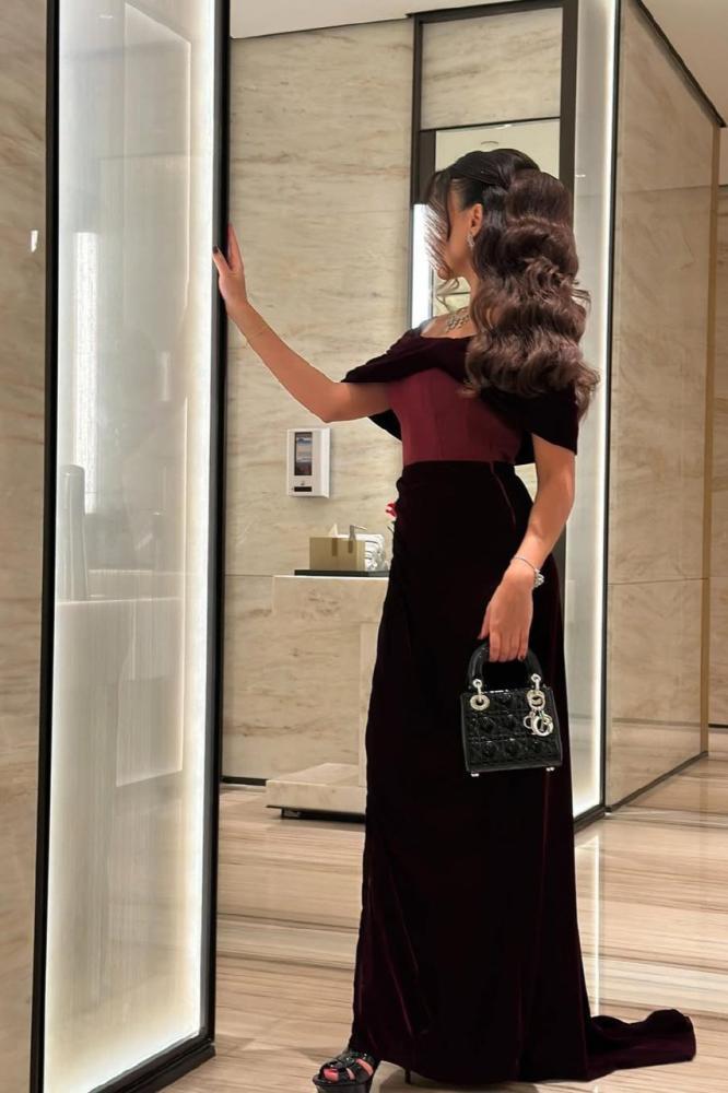فستان سهرة فاخر باللون البورغندي الداكن، يتميز بتصميم أنثوي راقٍ بأكتاف مكشوفة تبرز جمال القوام.