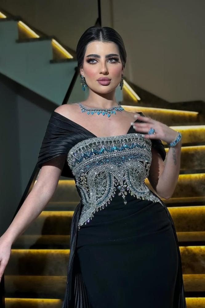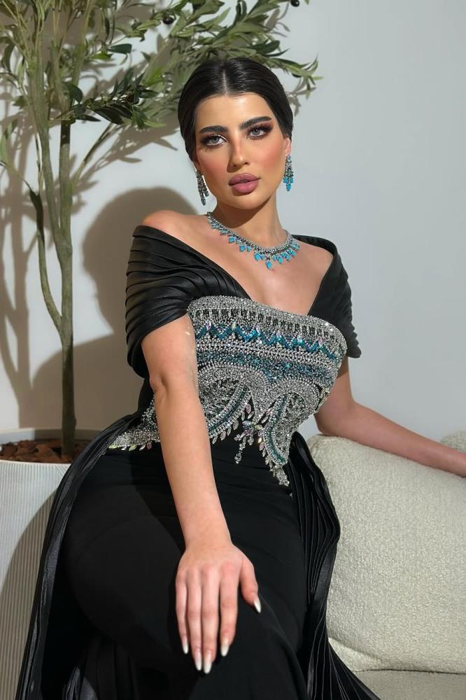 فستان سهرة راقٍ بتصميم كلاسيكي مميز، يتميز بقصة جذابة تبرز أنوثة القوام. مزين بتطريز فاخر بتفاصيل ملكية لامعة على الصدر،