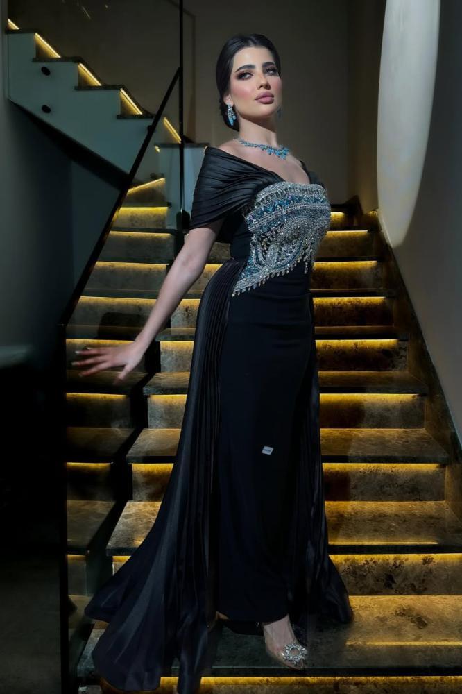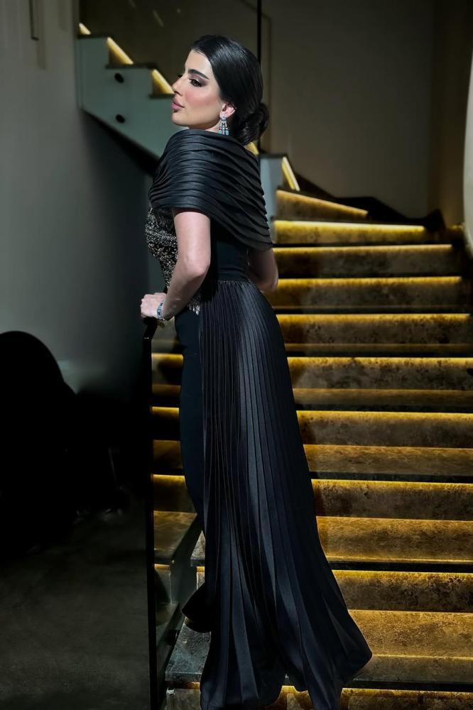 مع أكمام منسدلة تضيف لمسة راقية. يتدفق القماش بسلاسة ليضفي مظهراً أنيقاً ومبهرًا في السهرات الفاخرة.