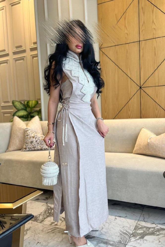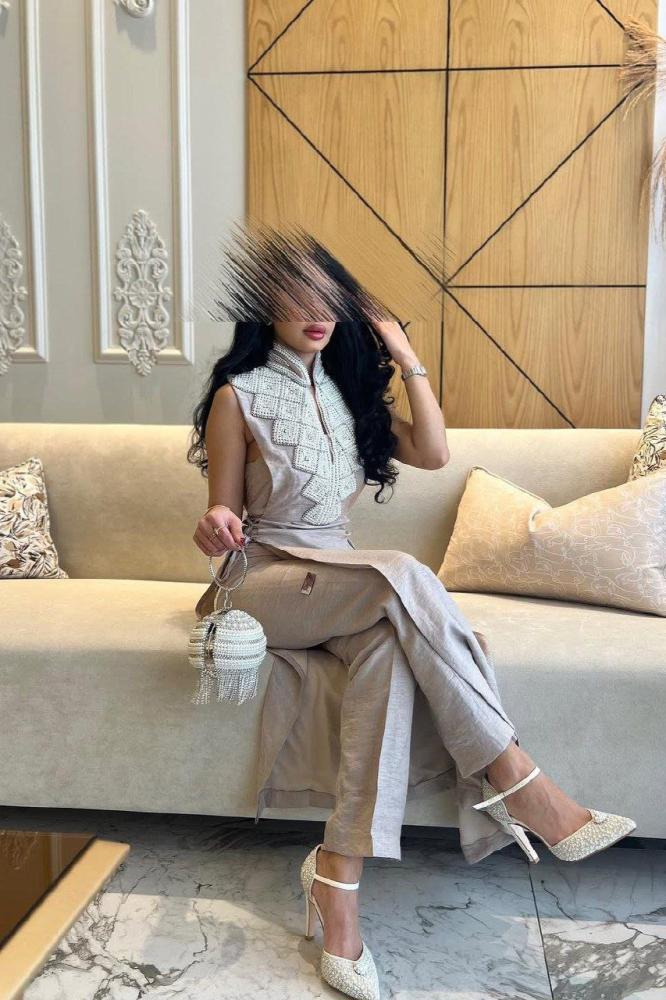 إطلالة عصرية راقية بتصميم مبتكر، يتكون من بلوزة بلا أكمام بتفاصيل أنيقة على الياقة، مع رباط جانبي يحدد الخصر بأسلوب جذاب.