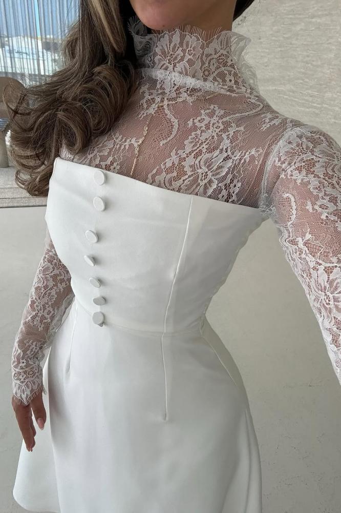 تصميم أنثوي أنيق بقصة متوسطة الطول، يتميز بفتحة رقبة كلاسيكية وأكمام طويلة من الدانتيل الفاخر لمظهر راقٍ.