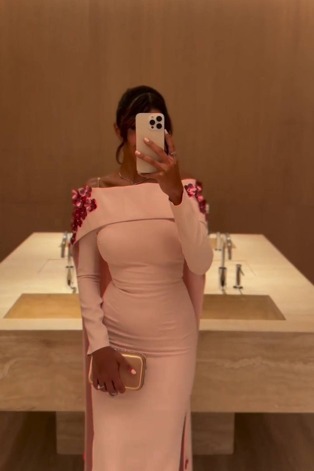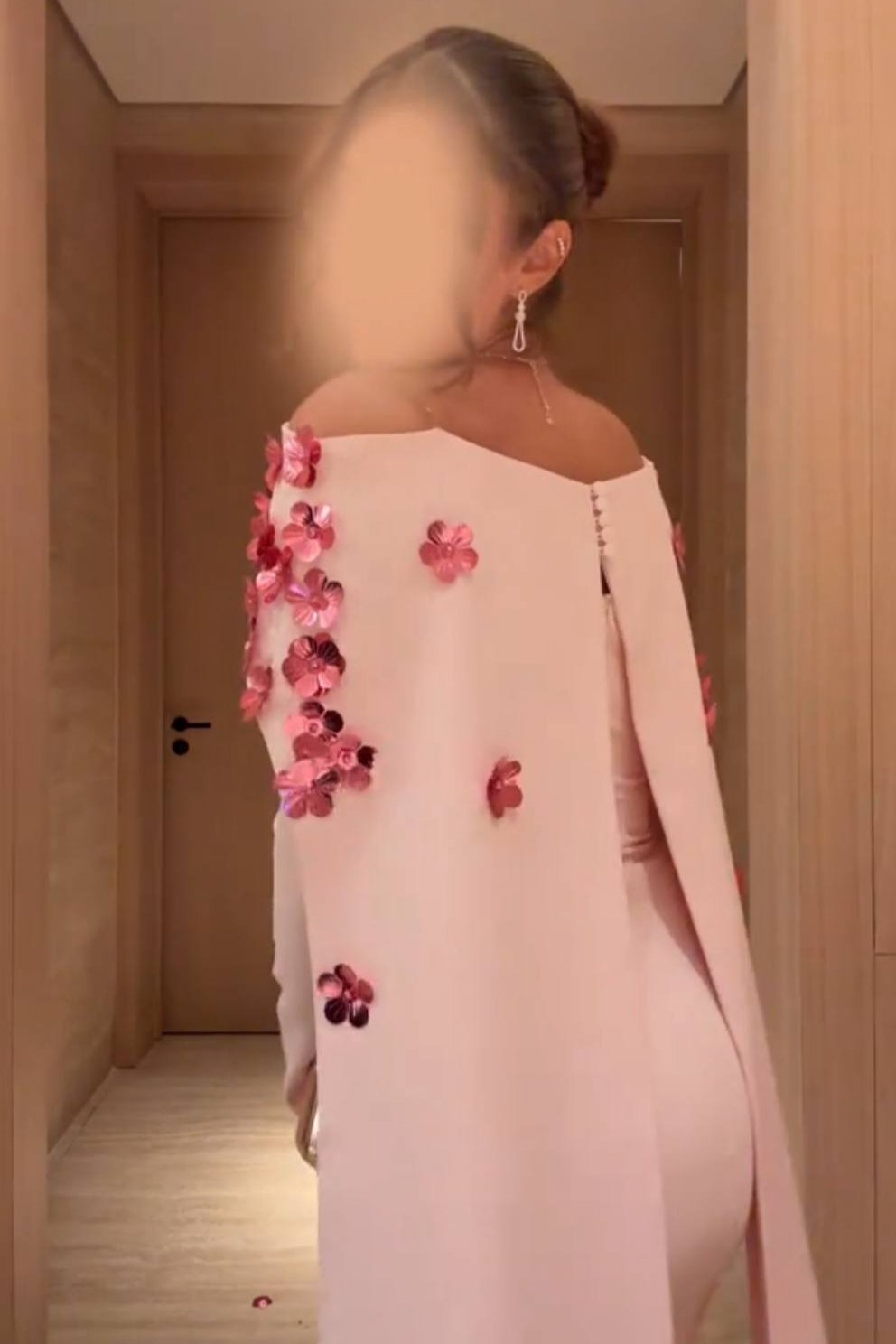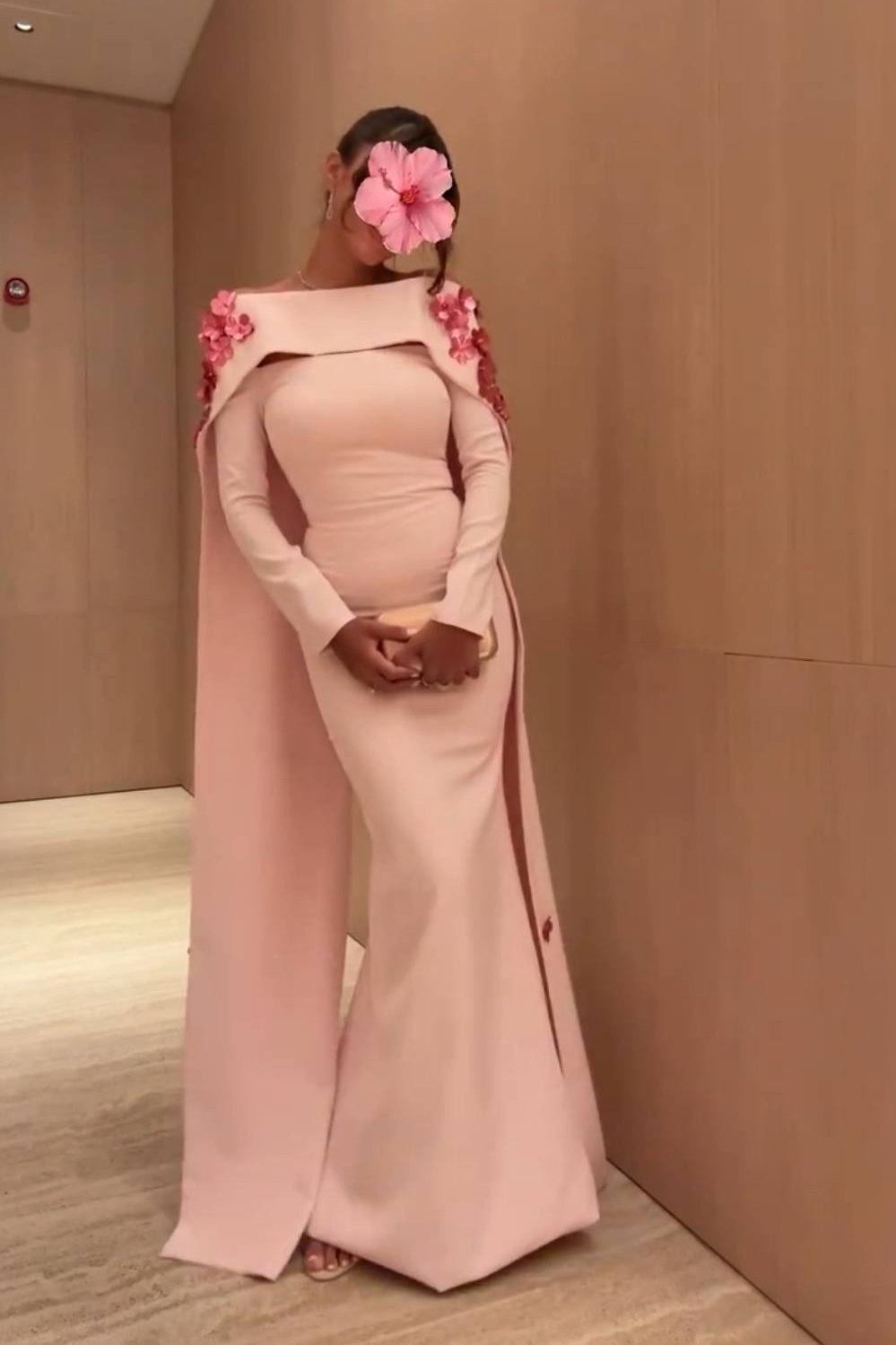 فستان سهرة وردي فاتح بكاب مطرز ورود ثلاثية الأبعاد