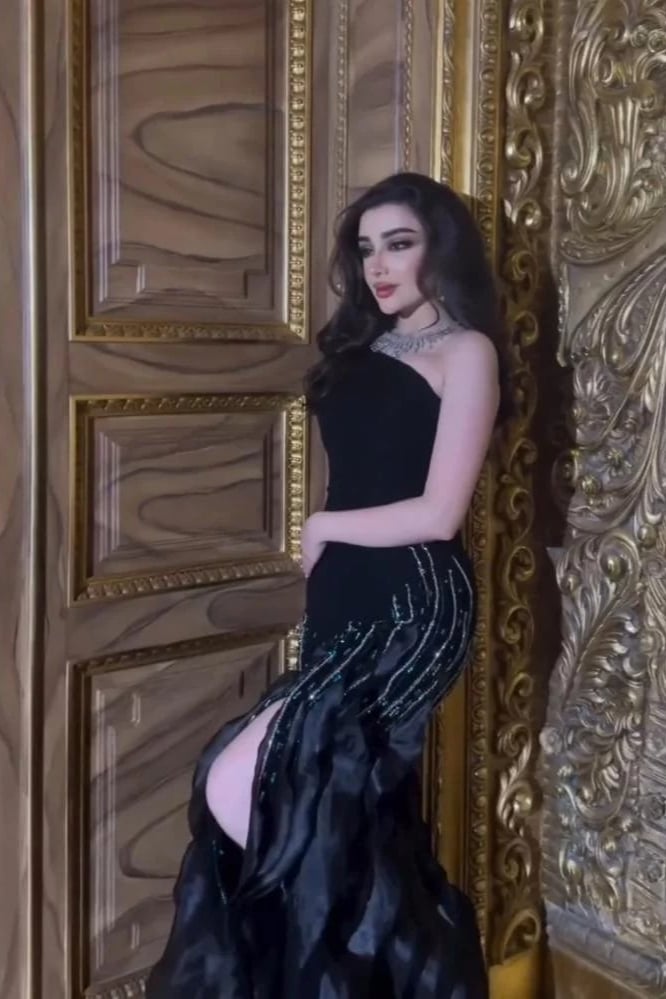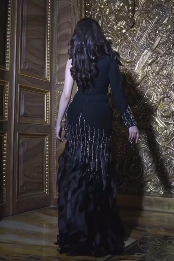 فستان سهرة أسود بكم واحد مع تطريز لامع وتنورة منسدلة