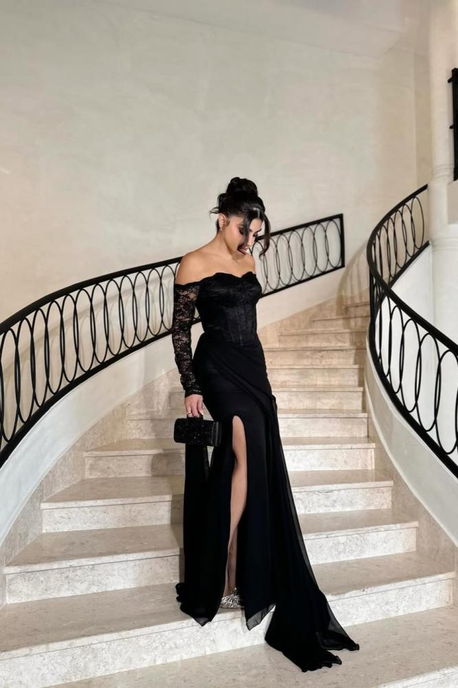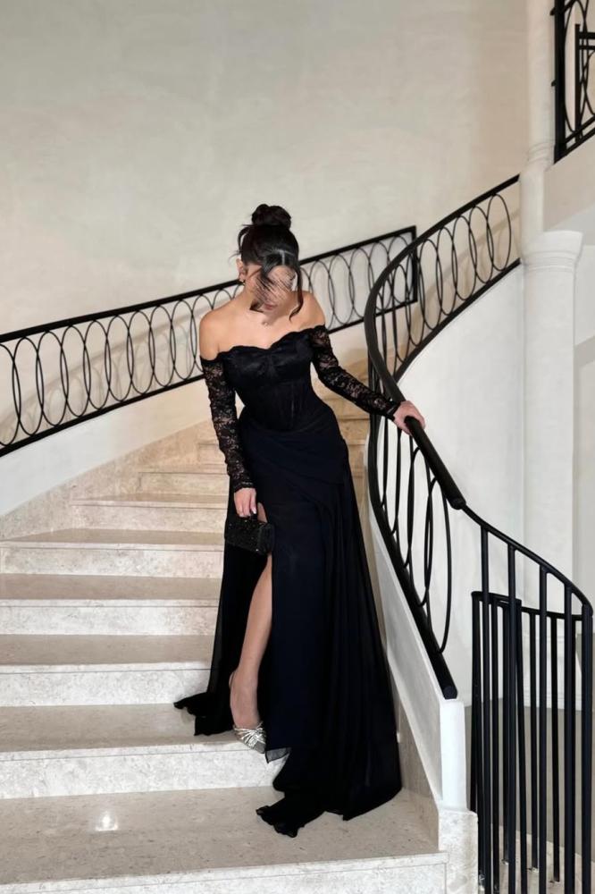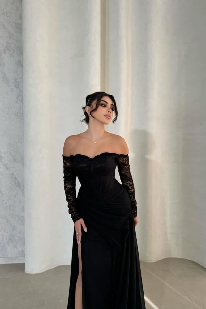 فستان أنثوي أنيق بقصة مكشوفة الأكتاف تضفي لمسة جذابة، مع أكمام من الدانتيل الراقي لإطلالة فاخرة.
