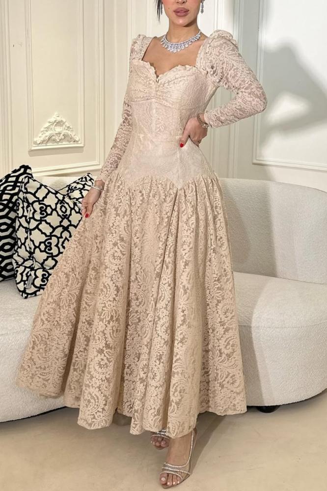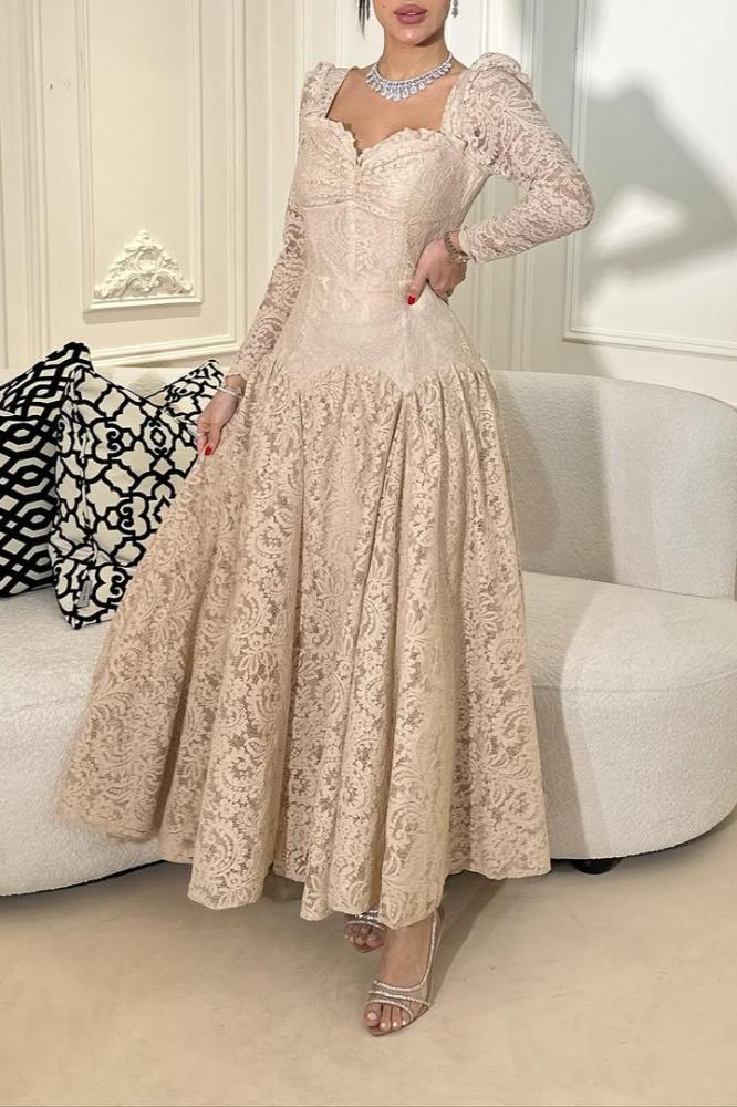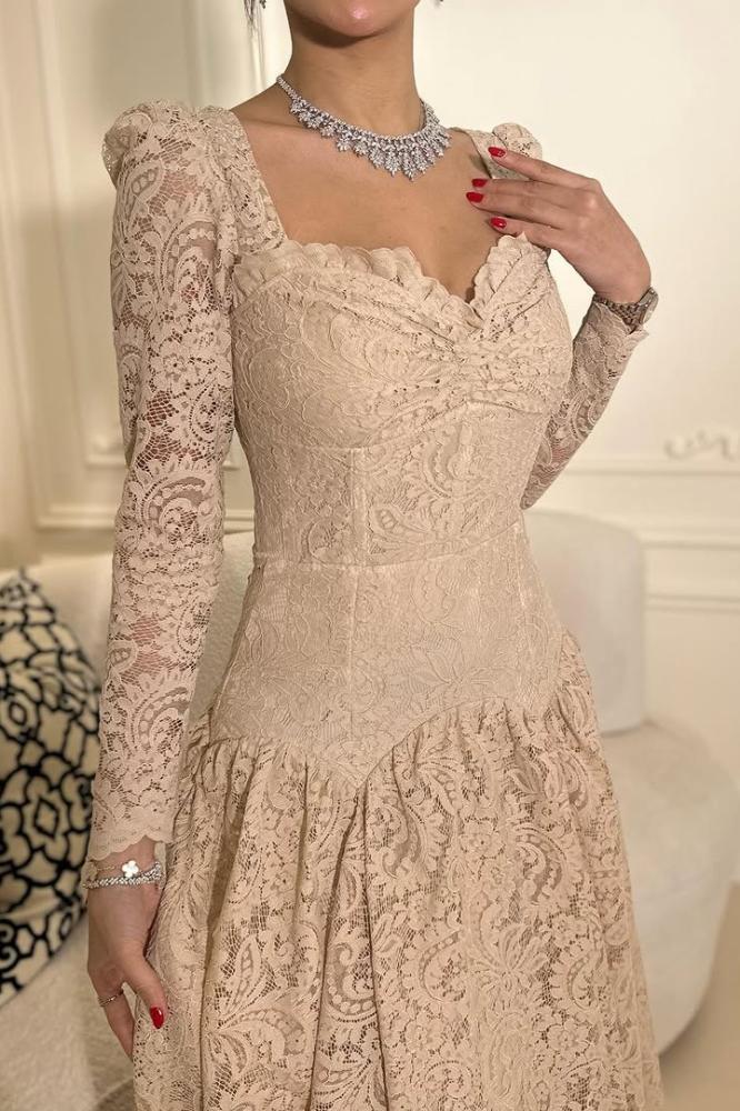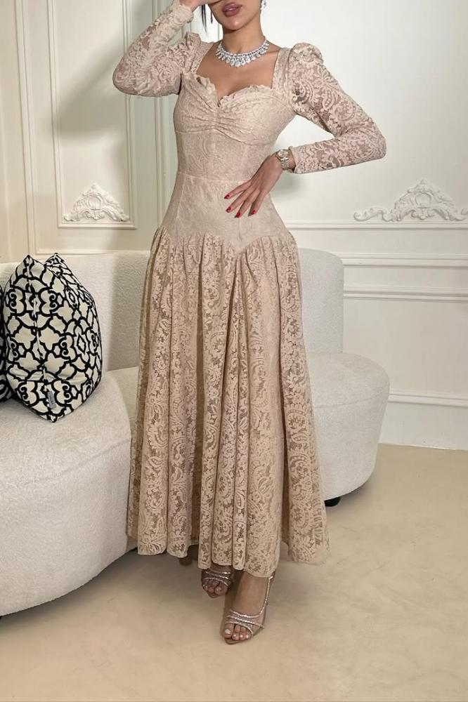 فستان سهرة فاخر بتصميم كلاسيكي أنيق، يتميز بأكمام طويلة من الدانتيل تضفي لمسة أنثوية راقية. القصة المحددة عند الخصر تنساب بتنورة واسعة لإطلالة ملكية ساحرة. التفاصيل المطرزة الناعمة تمنح الفستان فخامة خاصة، مما يجعله خيارًا مثالياً للسهرات والمناسبات الراقية.
