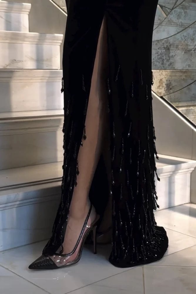 فستان سهرة أسود طويل أوف شولدر بشق أمامي مطرز