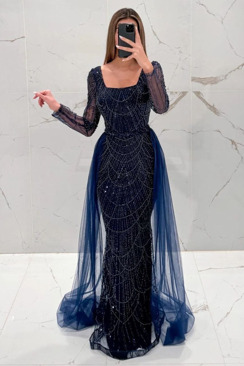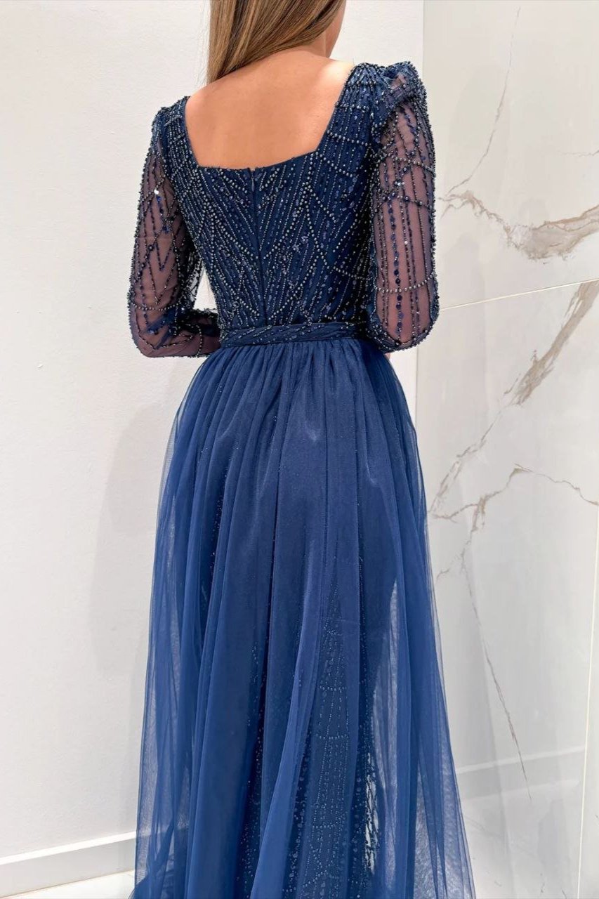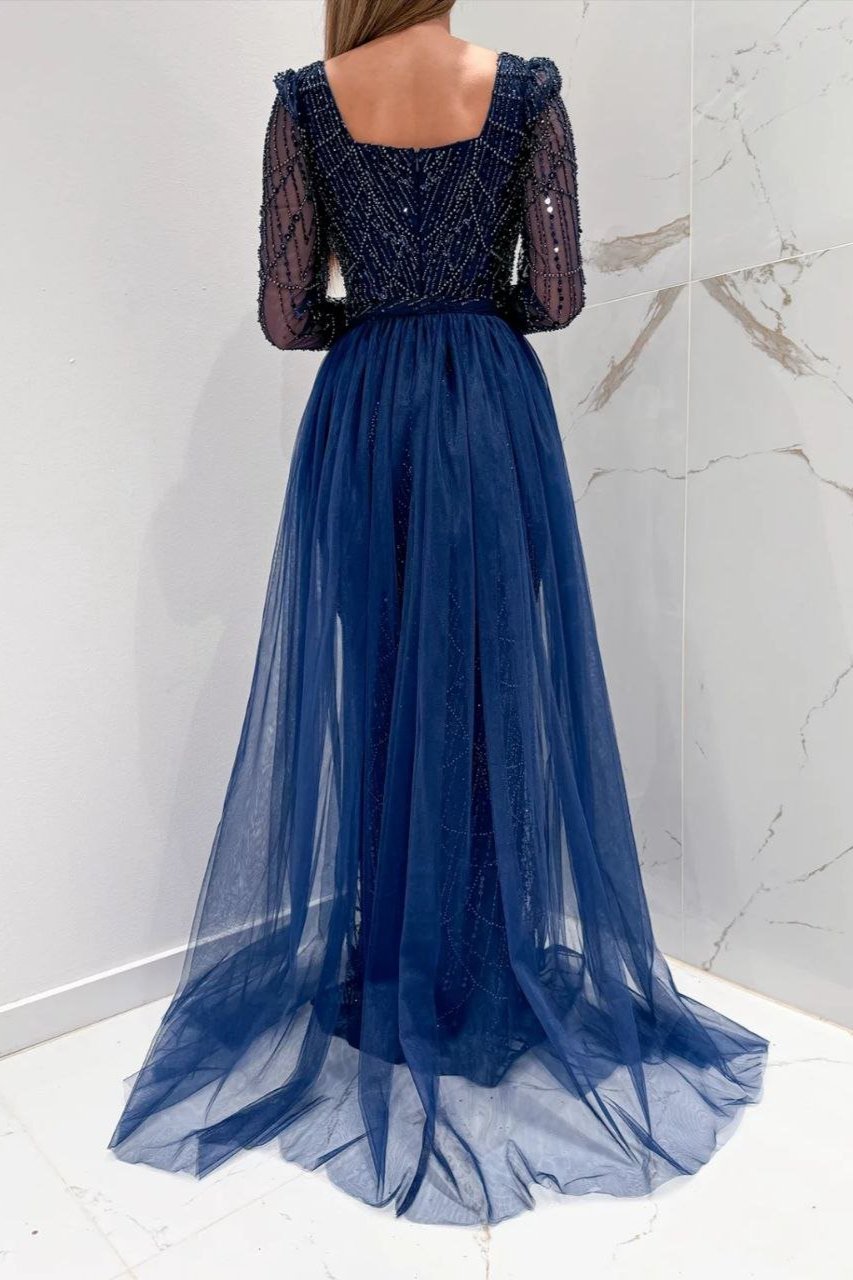 فستان سهرة كحلي طويل مطرز بالخرز مع أكمام شفافة وتنورة تول فاخرة