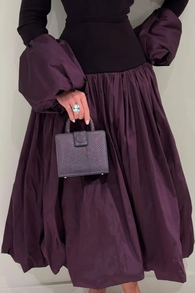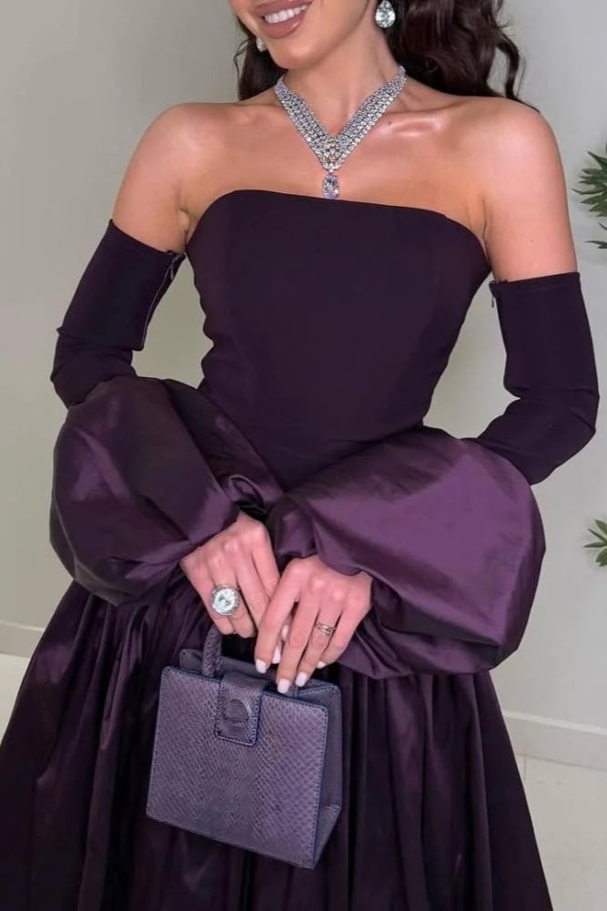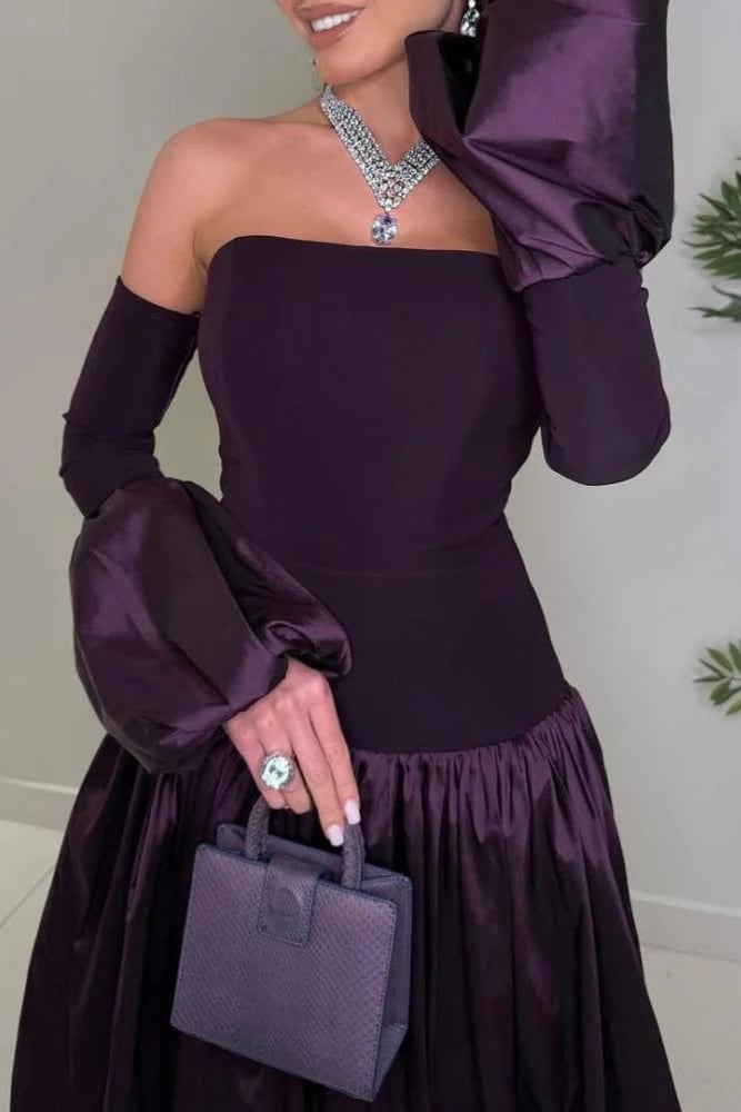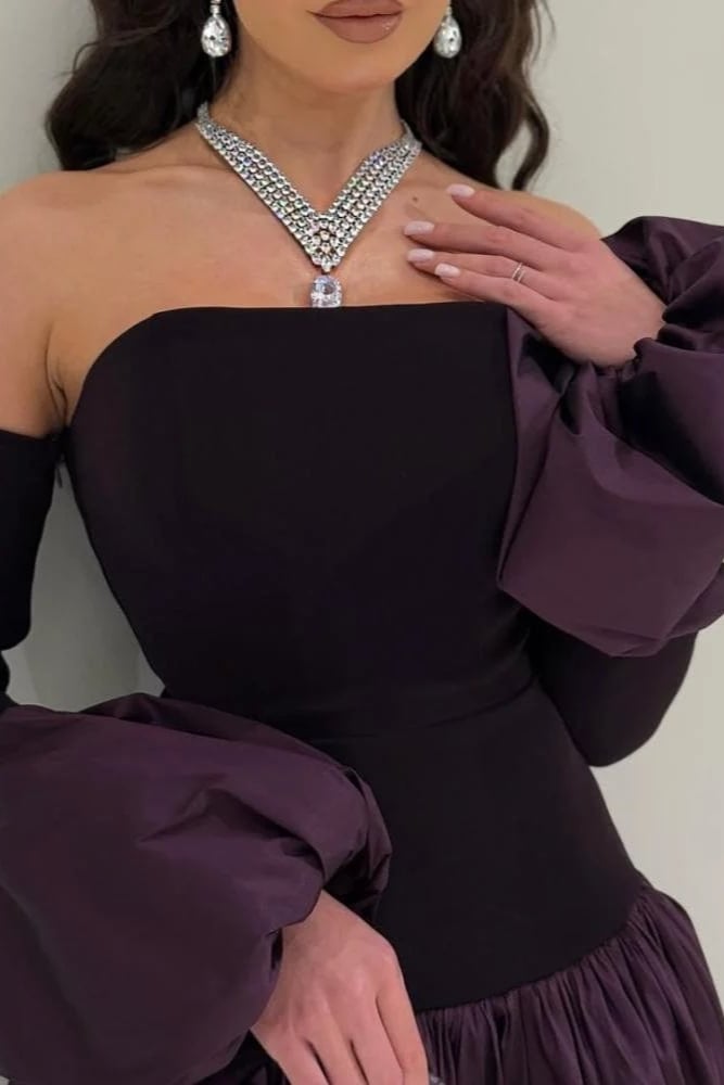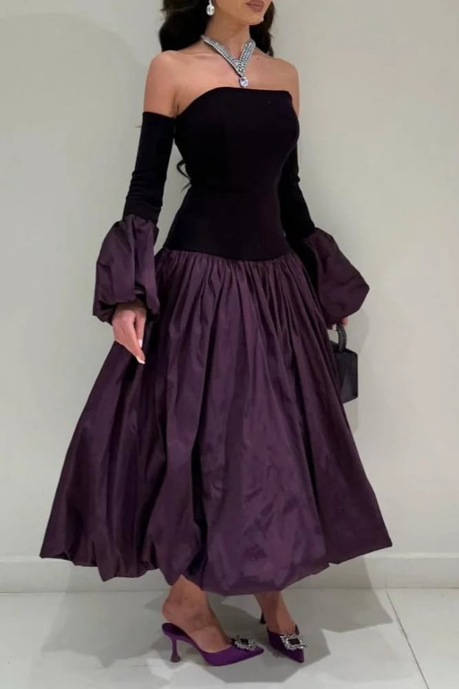 فستان سهرة بنفسجي منفوش مع أكمام أوف شولدر منفوخة