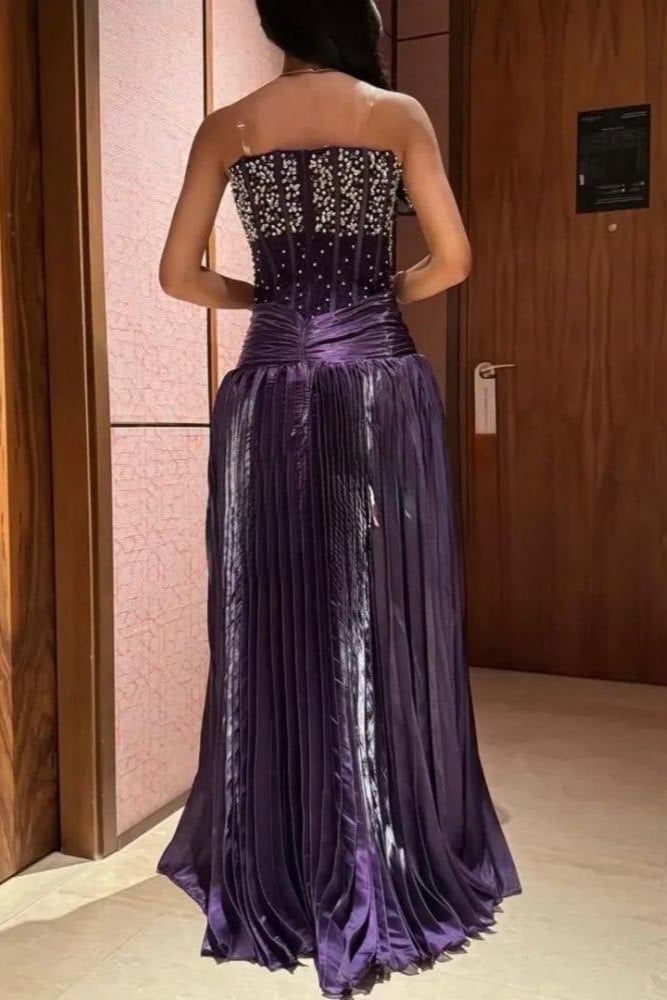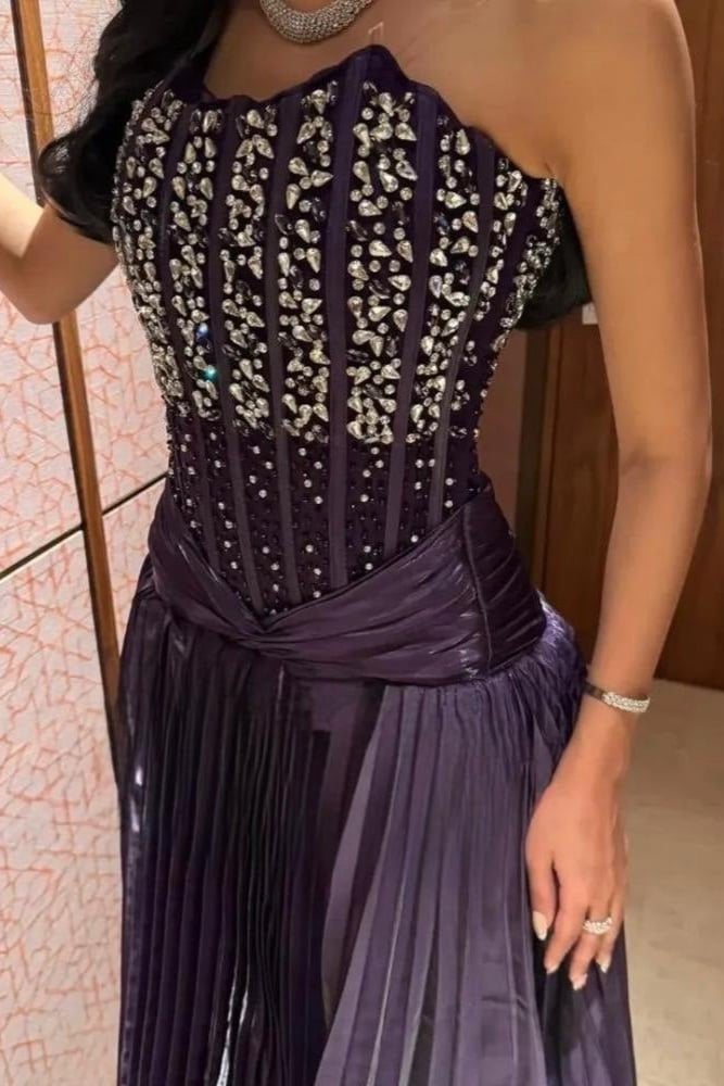 فستان سهرة بنفسجي طويل مطرز بكريستالات