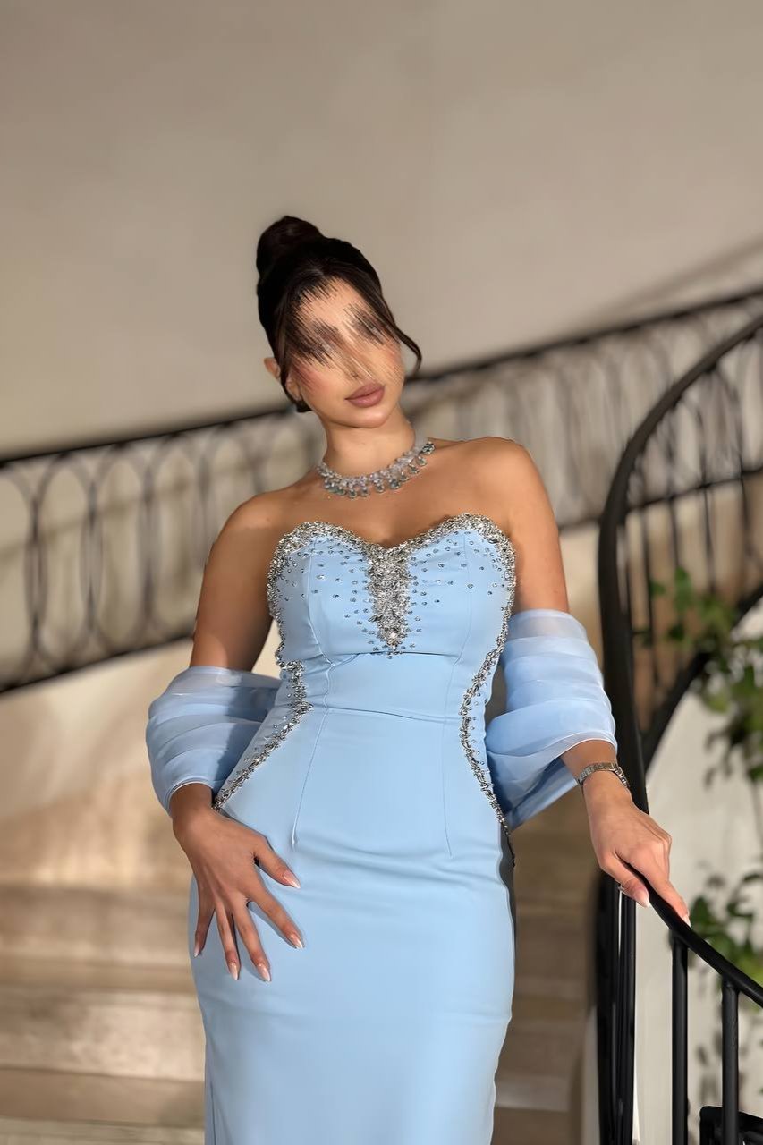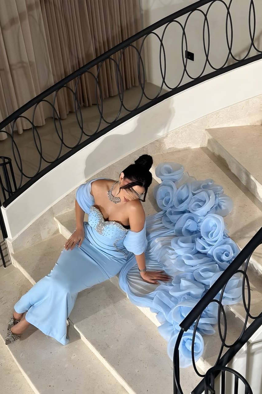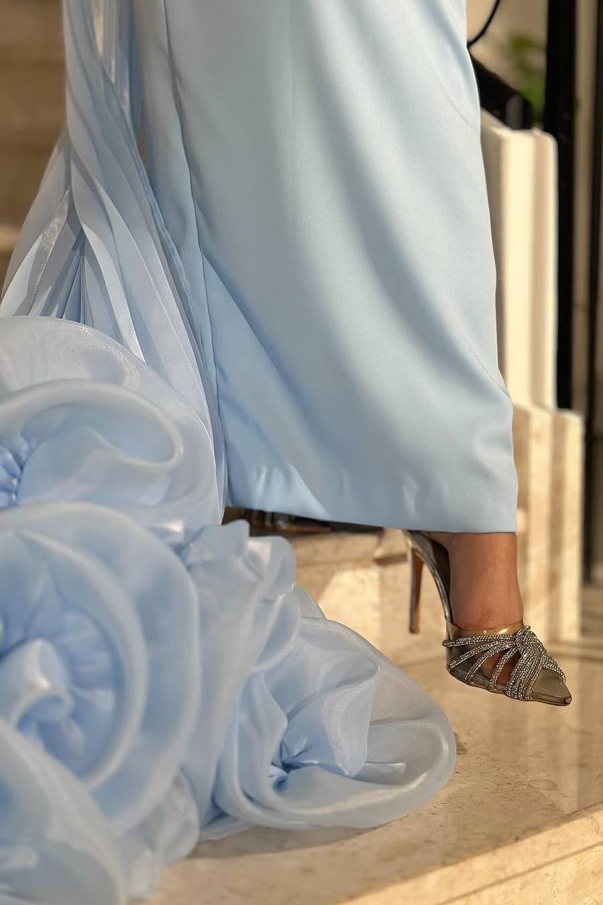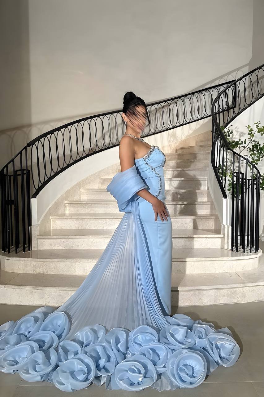 فستان سهرة مطرز سماوي مع ذيل مزخرف وأكتاف منسدلة