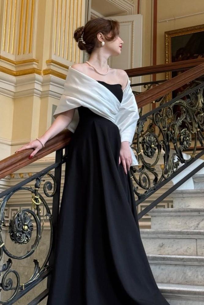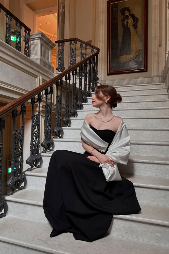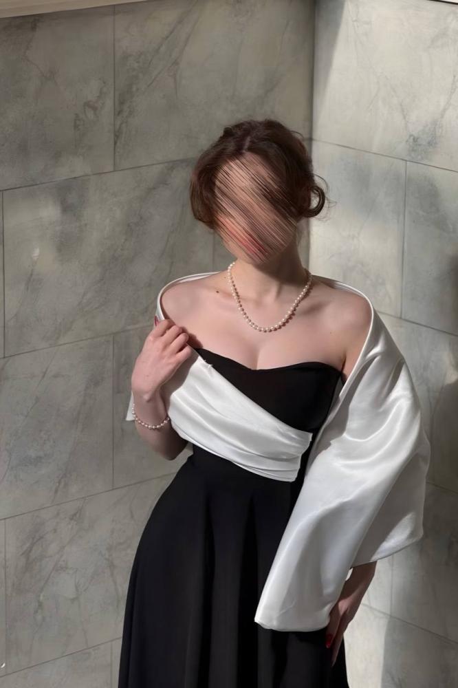 مع وشاح أبيض ملفوف حول الكتفين يضفي لمسة من الرقي والفخامة. خيار مثالي للمناسبات الرسمية والسهرات المميزة.