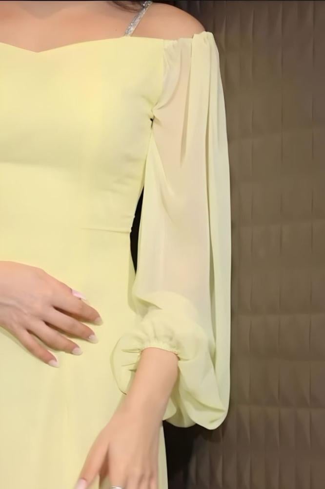 الأكمام الشفافة المنفوخة تضيف له مظهراً حالماً وأنيقاً، بينما القصة المتوسطة الطول تجعله مناسباً لمختلف المناسبات الراقية.