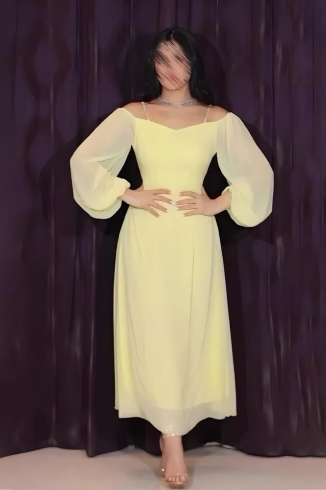 فستان أنيق بتصميم ناعم باللون الأصفر، يتميز بقصة جذابة مكشوفة الأكتاف مع حمالات رفيعة، مما يمنحه لمسة أنثوية راقية.