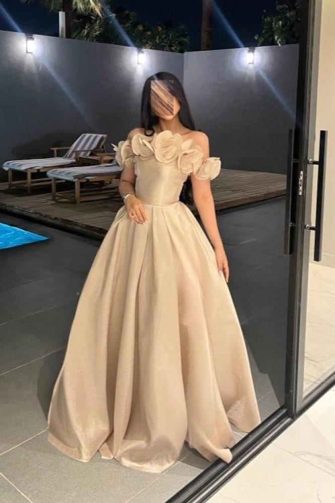 فستان سهرة طويل بتصميم فخم بلمسة رومانسية، يتميز بقصّة منفوشة تضفي طابعاً ملكياً ساحراً. الأكتاف مكشوفة مع تفاصيل زهرية جذابة تمنحك إطلالة أنثوية راقية. مثالي للمناسبات الفاخرة وحفلات الزفاف.