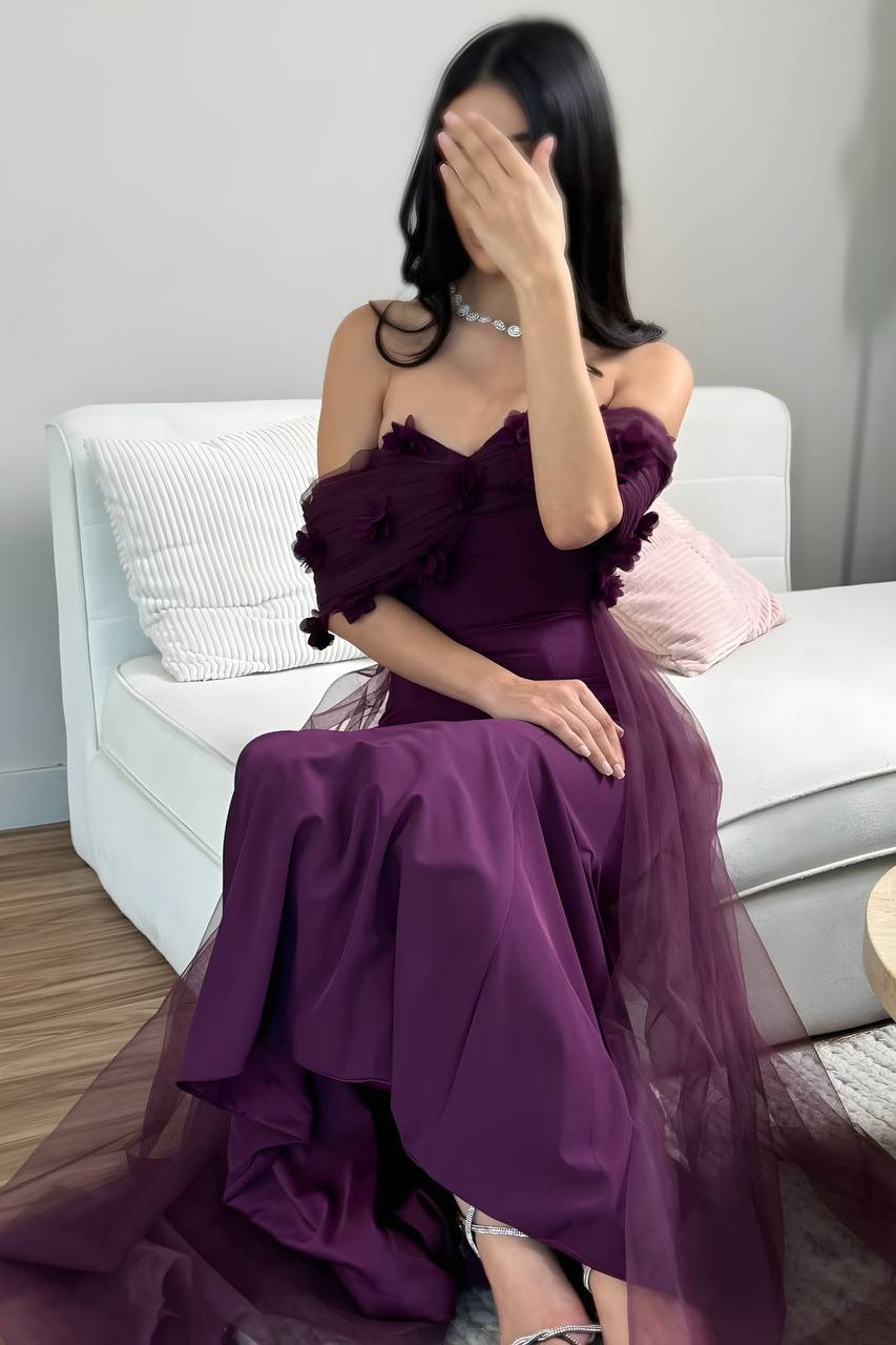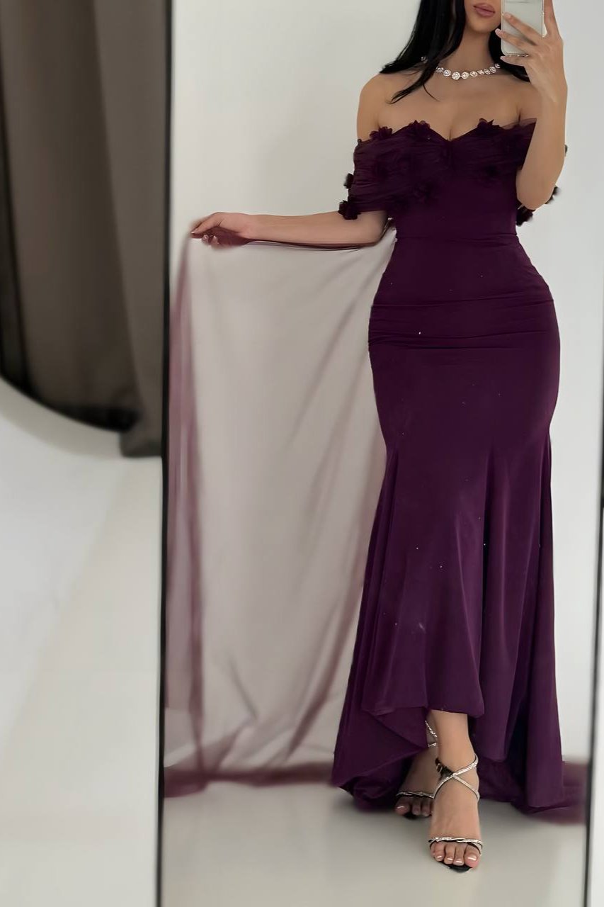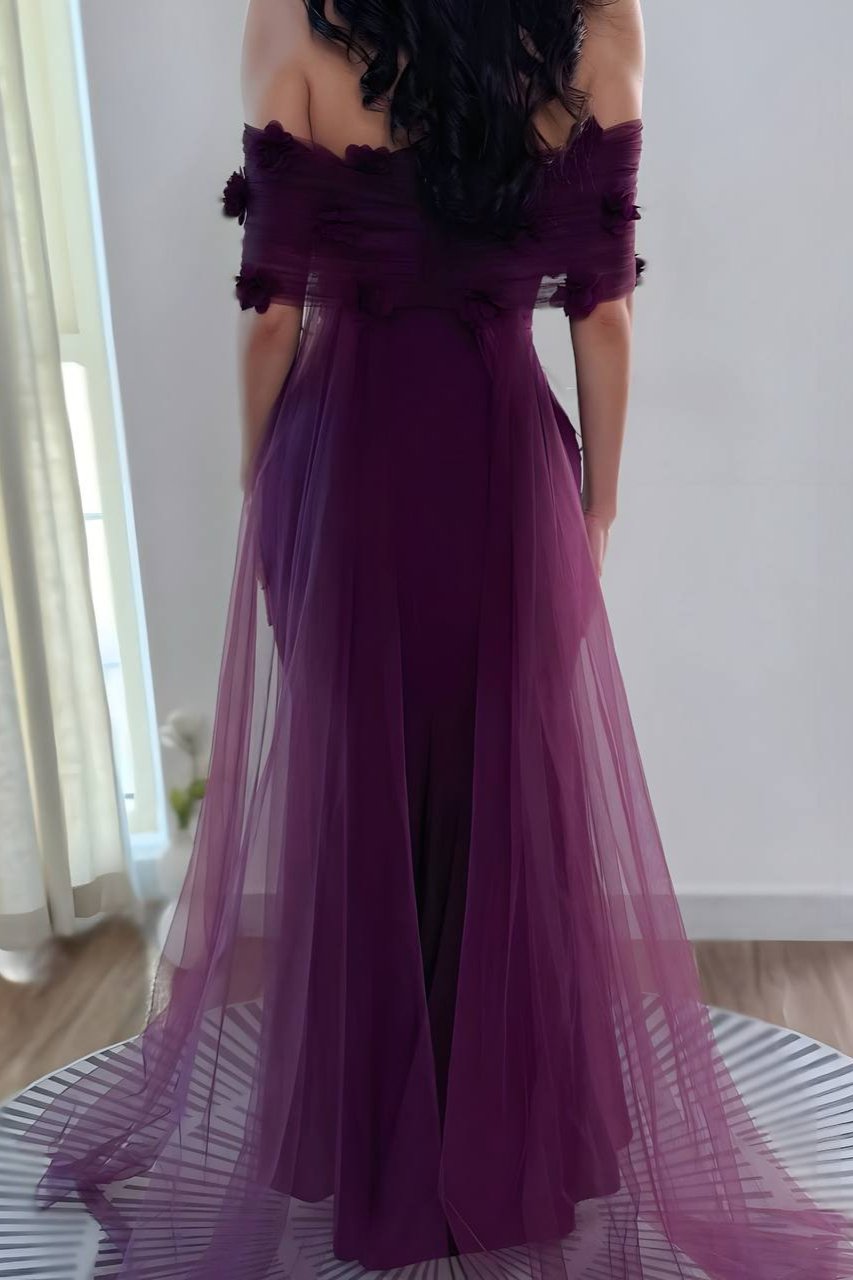 فستان سهرة أوف شولدر باللون البنفسجي الداكن مزين بالزهور وذيل تول ملكي