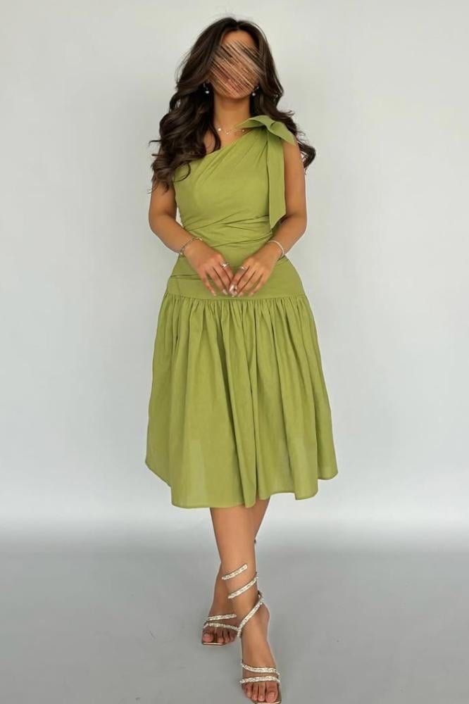 فستان أنيق مصمم بقصة غير متناسقة تضفي لمسة عصرية مميزة. يتميز بحزام خصر ضيق لإبراز جمال القوام، مع تنورة منفوشة بحواف واسعة تمنحك إطلالة مفعمة بالأنوثة والنعومة. الكتف المكشوف يضيف لمسة جذابة، مما يجعله مثالياً للمناسبات الخاصة والسهرات الأنيقة.
