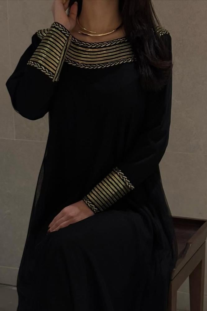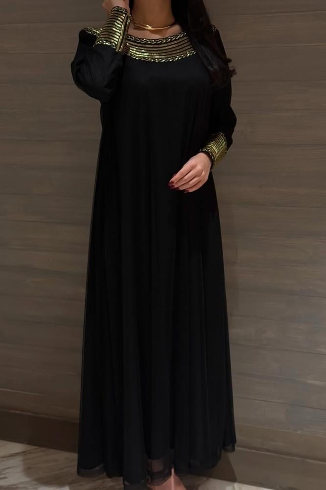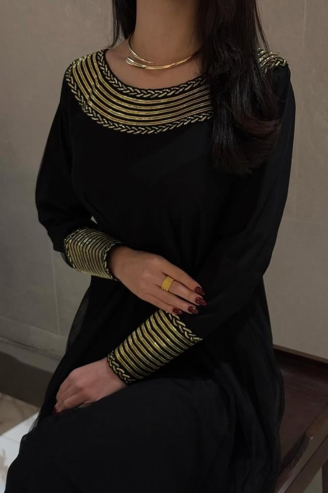 تألقي بإطلالة أنيقة مع هذا الفستان الأسود الفاخر المصمم بأسلوب واسع وانسيابي يمنحك راحة وفخامة في آنٍ واحد. يزدان بتطريزات ذهبية راقية حول الرقبة والأكمام، مما يضفي عليه لمسة ملكية ساحرة. التصميم المحتشم يجعله خيارًا مثاليًا للسهرات والمناسبات الرسمية، حيث يجمع بين البساطة والفخامة بأسلوب عصري أنيق. نسقيه مع إكسسوارات ذهبية لإطلالة متكاملة تزيدك سحرًا وتألقًا.