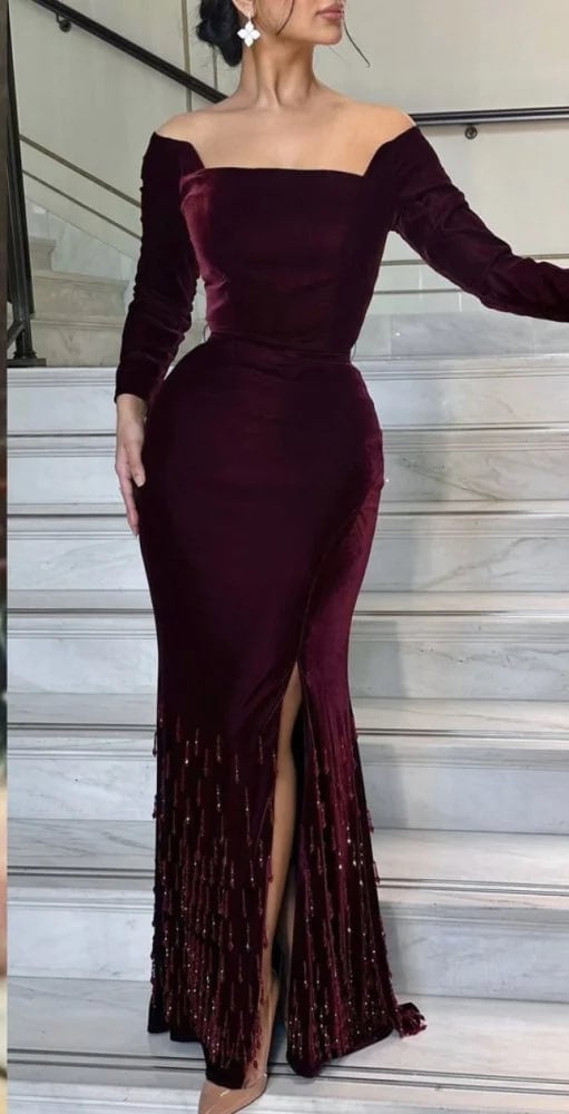 فستان سهرة مخملي برغندي طويل بأكمام طويلة مع فتحة ساق