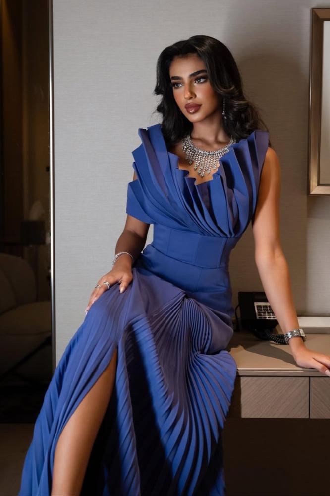 فستان أنيق بلون أزرق ملكي مصمم بقصة انسيابية تعزز من جمال القوام. يتميز بأكتاف مجسمة مع ثنيات أنيقة تضيف لمسة من الفخامة،