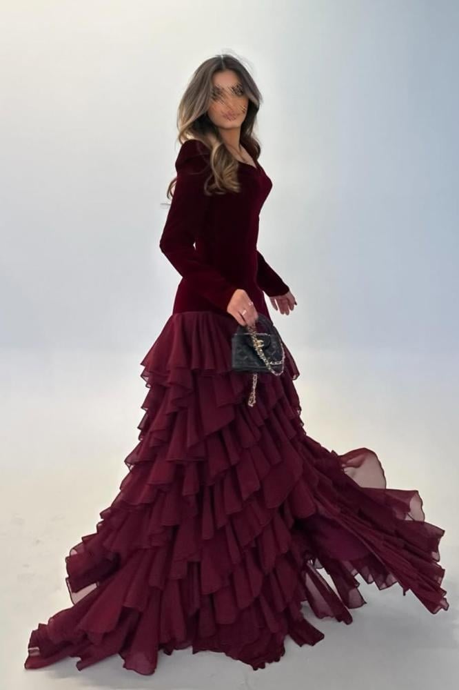 فستان سهرة أنيق بلمسة فاخرة وتصميم يجمع بين الفخامة والرقي. يأتي بأكمام طويلة وقصة علوية محددة تمنحك إطلالة راقية، مع تنورة مزينة بطبقات من الكشكش المتدرج تضيف حركة ساحرة ومظهرًا أنثويًا جذابًا. اللون الخمري العميق يعزز من جمال التصميم، ليكون اختيارًا مثاليًا للمناسبات الفاخرة.