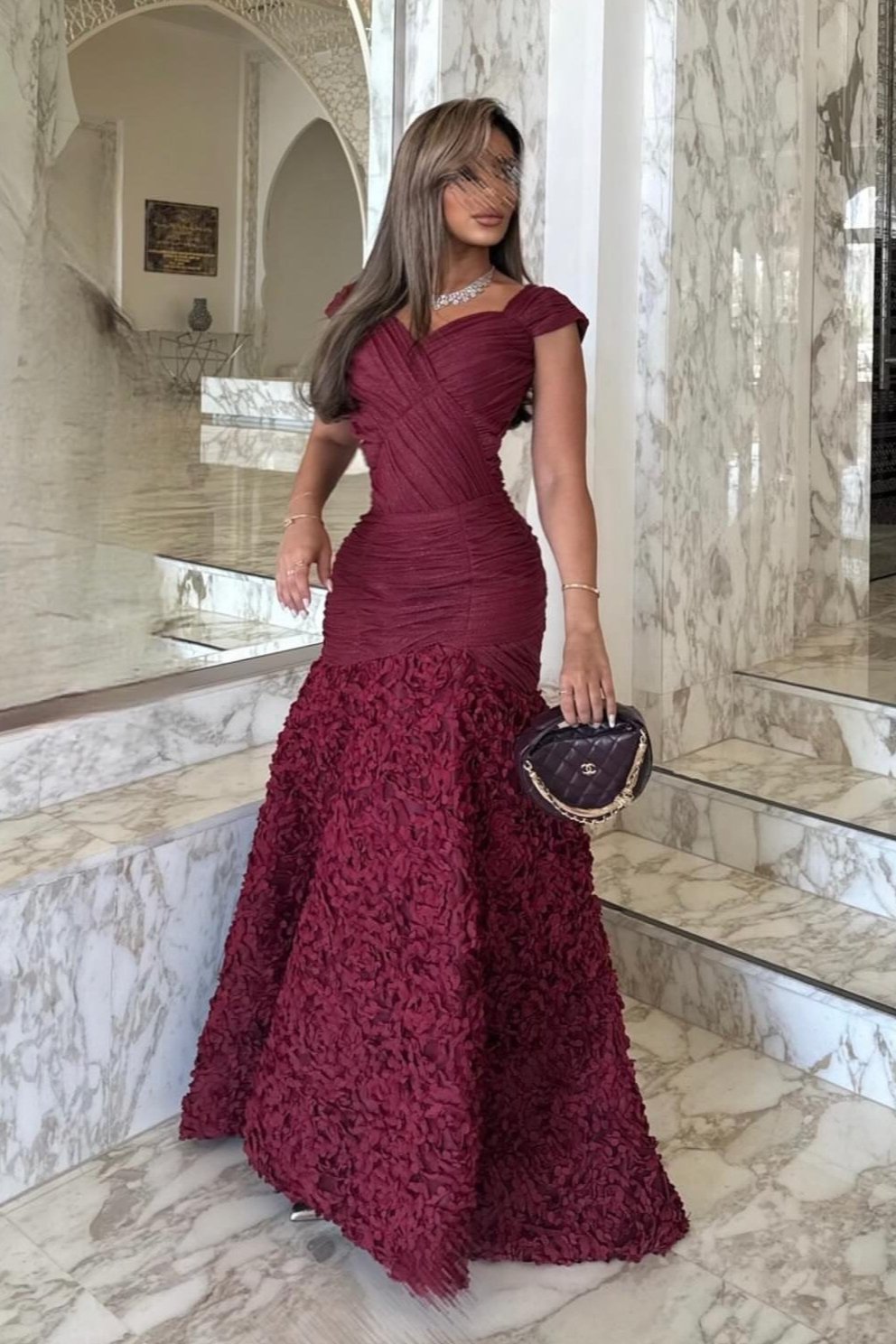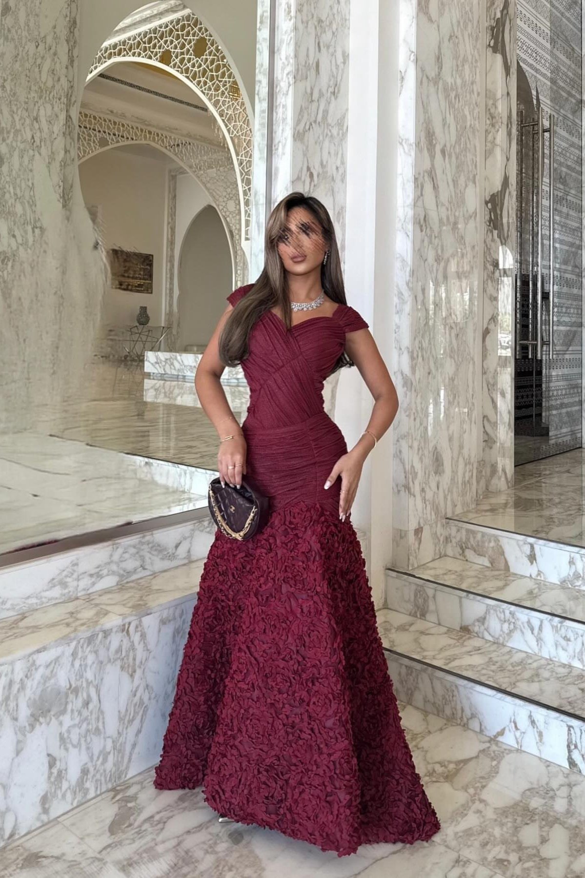 فستان سهرة عنابي طويل مورّد بتصميم درابيه فاخر