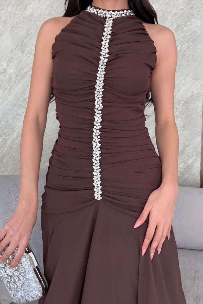 تألقي بإطلالة راقية مع هذا الفستان البني الفاخر، المصمم بقصة متوسطة الطول تبرز أنوثتك بأسلوب جذاب.