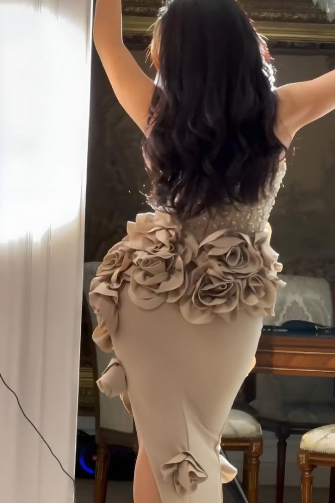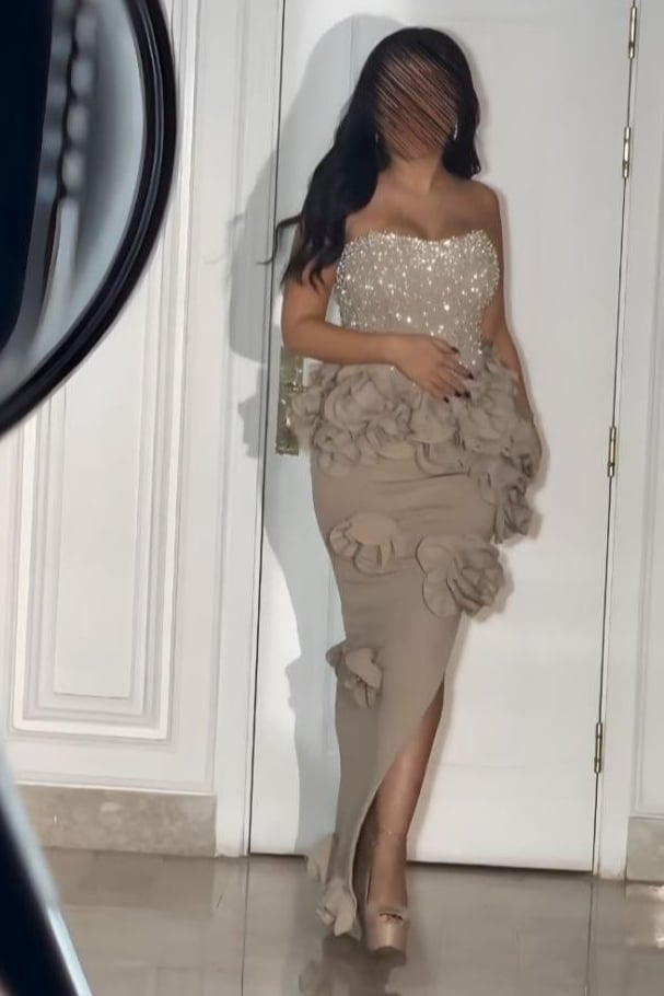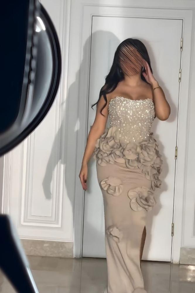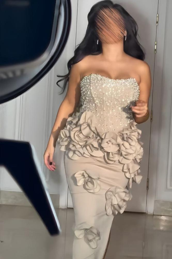 فستان سهرة بيج بتصميم كسرات وردية