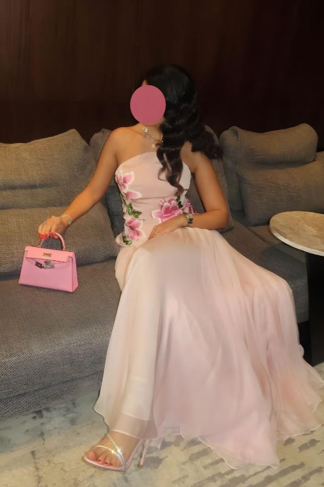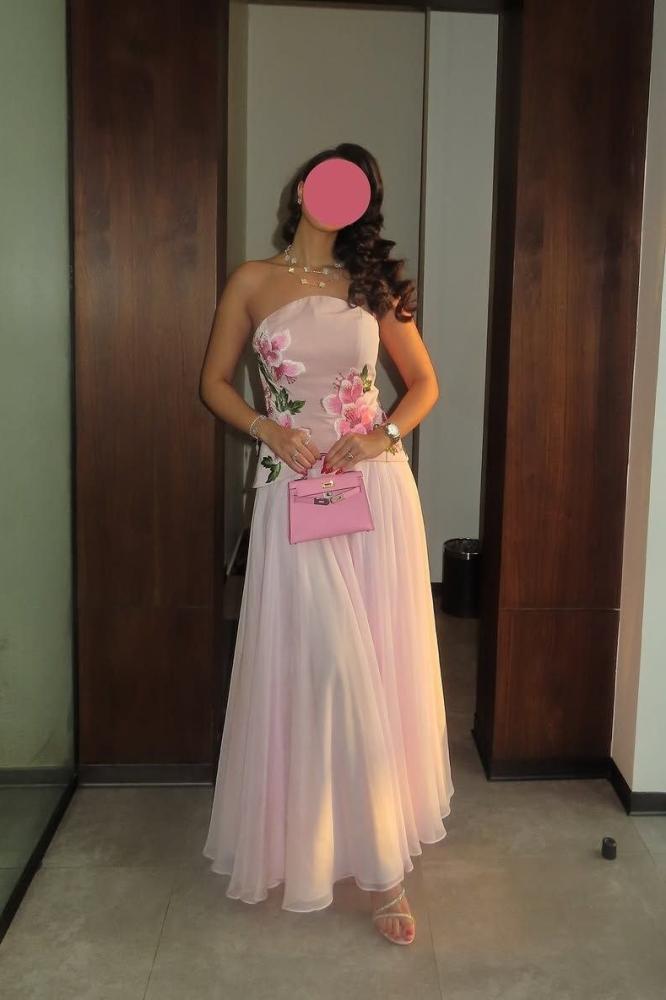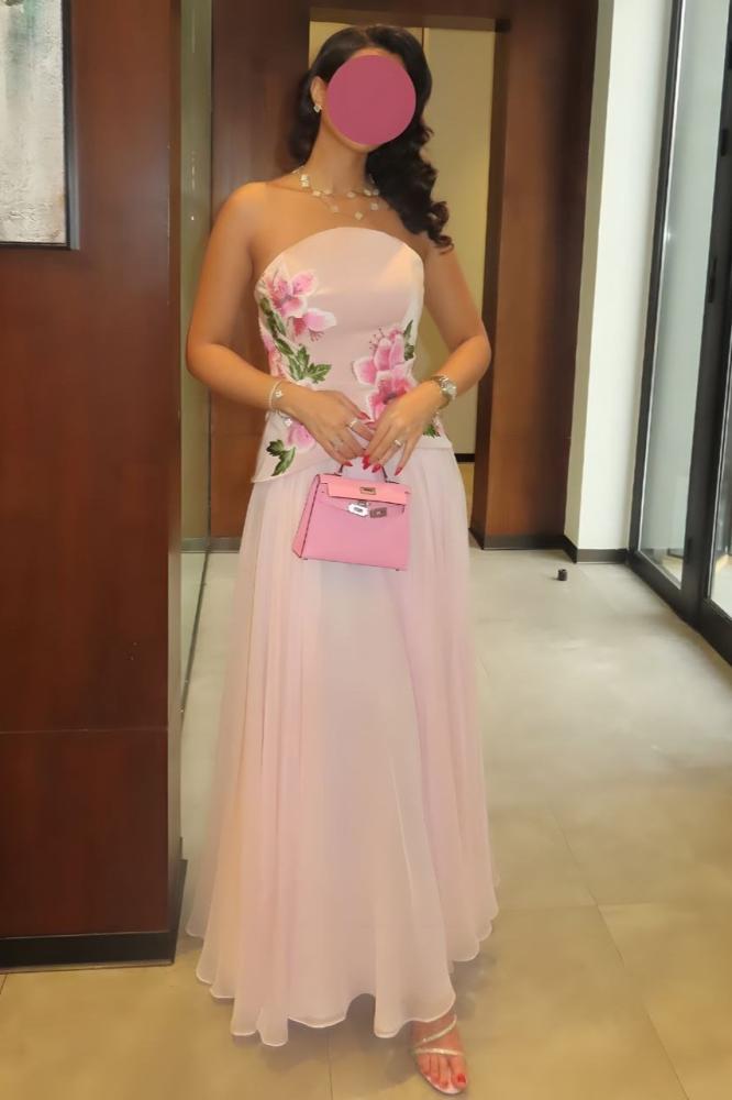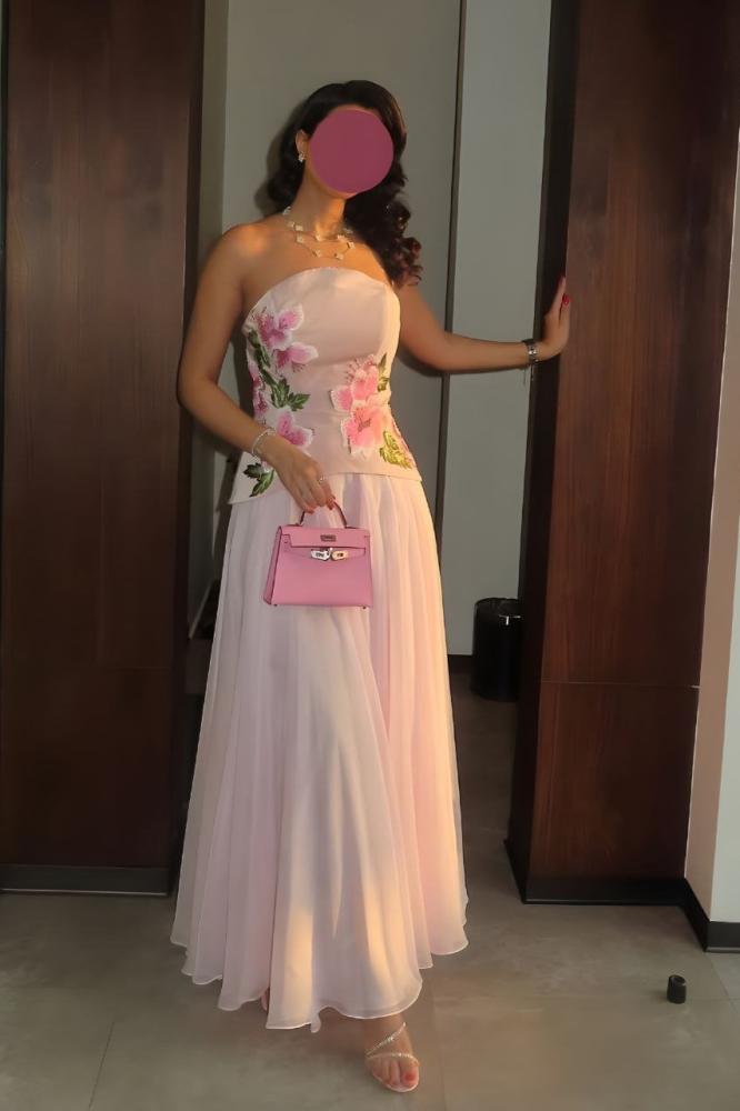 فستان سهرة أنيق بتصميم ناعم وأنثوي، يتميز بلونه الوردي الهادئ مع لمسات من الزهور المطرزة التي تضيف له سحرًا خاصًا.