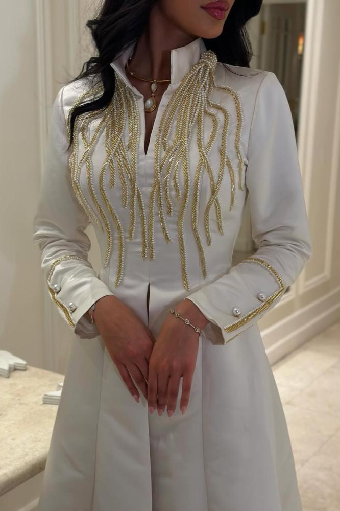 فستان راقٍ بقصة ملكية يعكس الفخامة والتألق، بتصميم طويل وأنيق مزين بتطريزات ذهبية تضيف لمسة فاخرة.