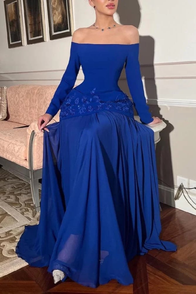 فستان سهرة أزرق طويل أوف شولدر
