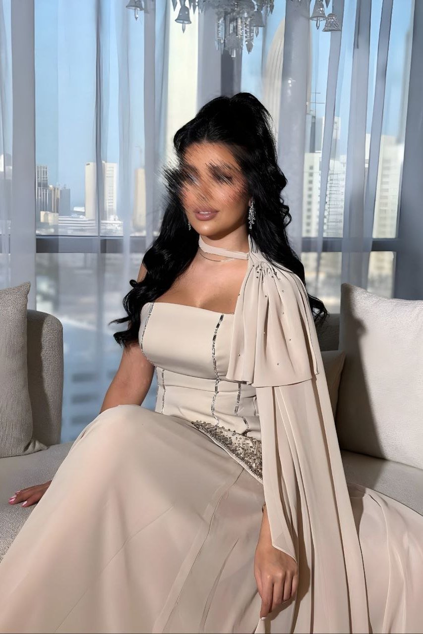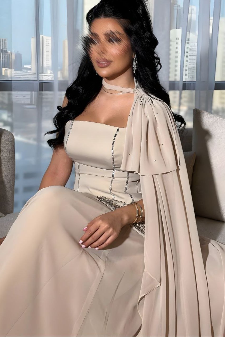فستان سهرة بيج طويل بتطريزات مع وشاح جانبي