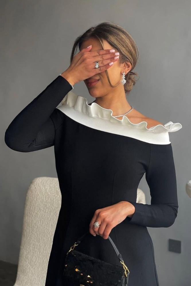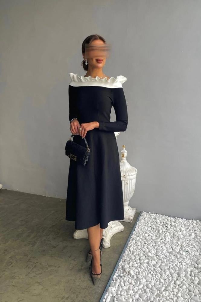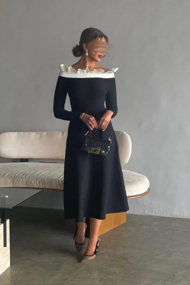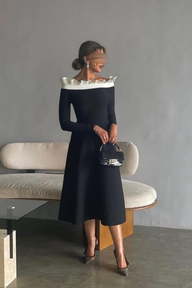 فستان أنيق بطول ميدي بقصة كلاسيكية راقية، يأتي باللون الأسود مع أكمام طويلة تضيف لمسة من الفخامة،