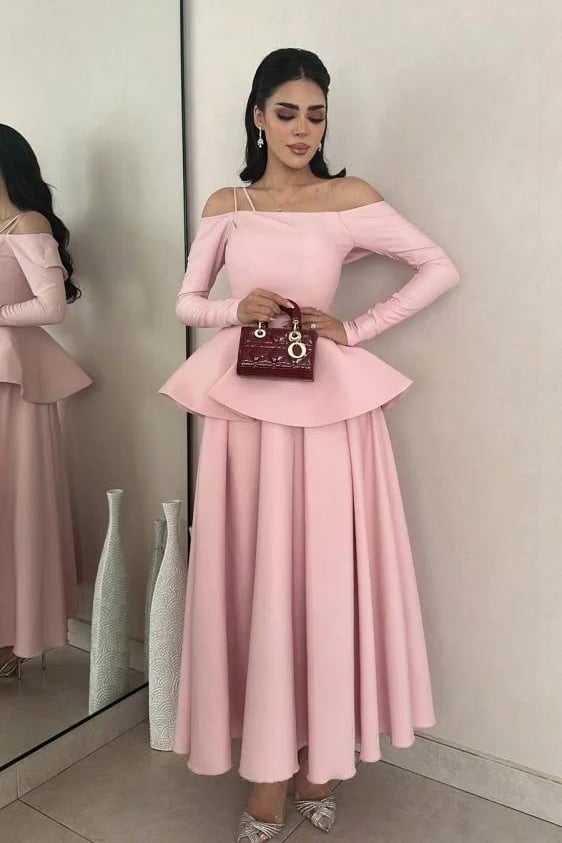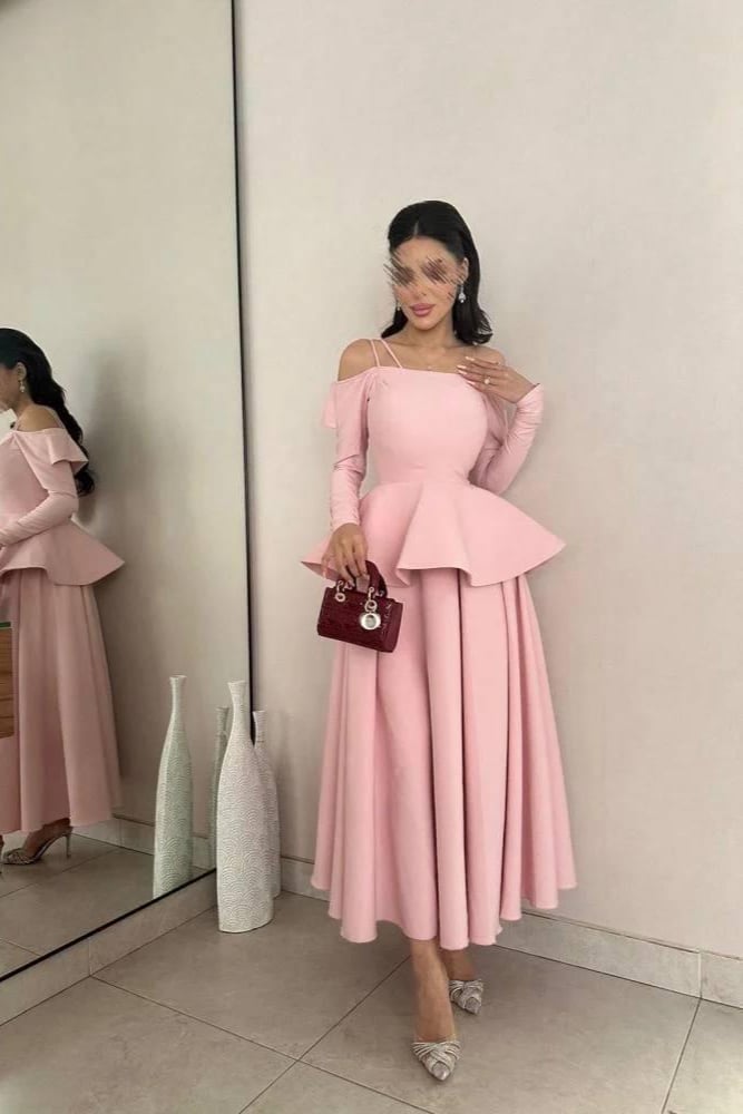 فستان وردي أنيق بتصميم راقٍ وجذاب، يتميز بأكمام طويلة وأكتاف مكشوفة تضفي لمسة أنثوية راقية.