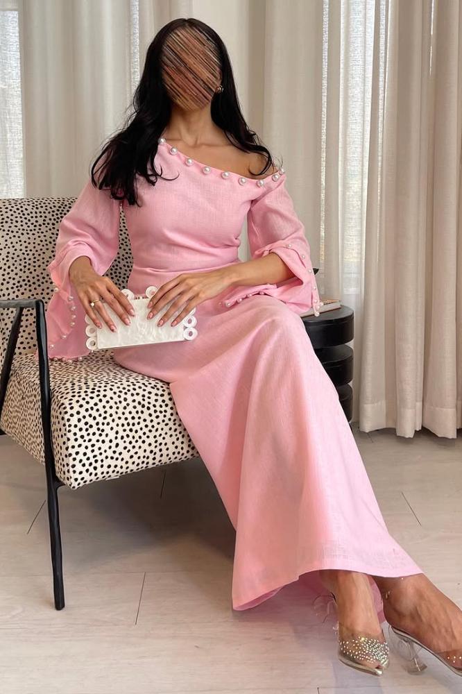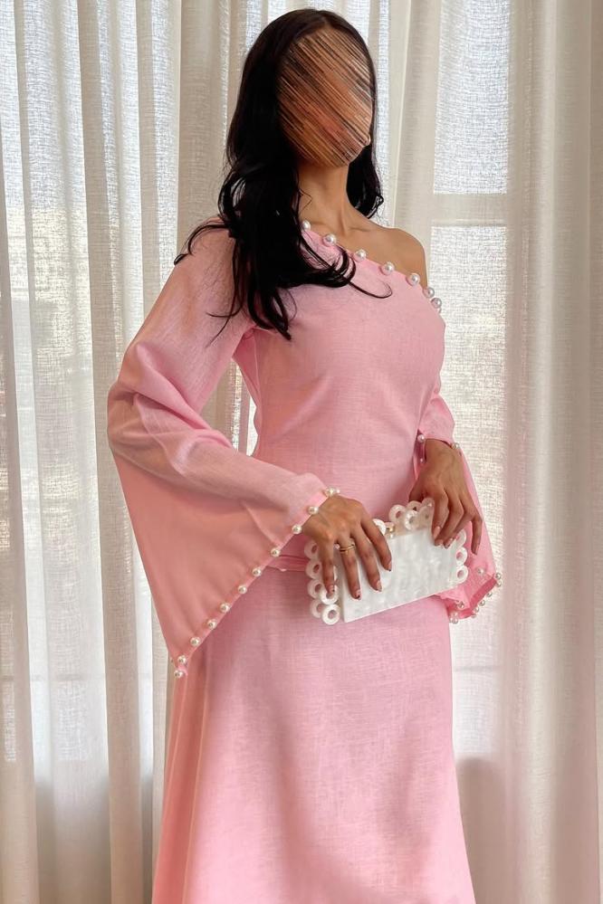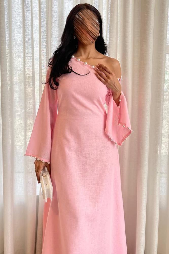 فستان طويل راقٍ ومميز. تتميز بقصة الكتف المكشوف التي تضفي لمسة أنثوية ناعمة، مع فتحات واسعة بتفاصيل أنيقة كما من مظهر الجمال. تأتي بقصة انسيابية وتفكر راحة وأناقة الجيل الجديد، مما يشكل خيارًا مثاليًا للمناسبات الراقية والإطلالات.
