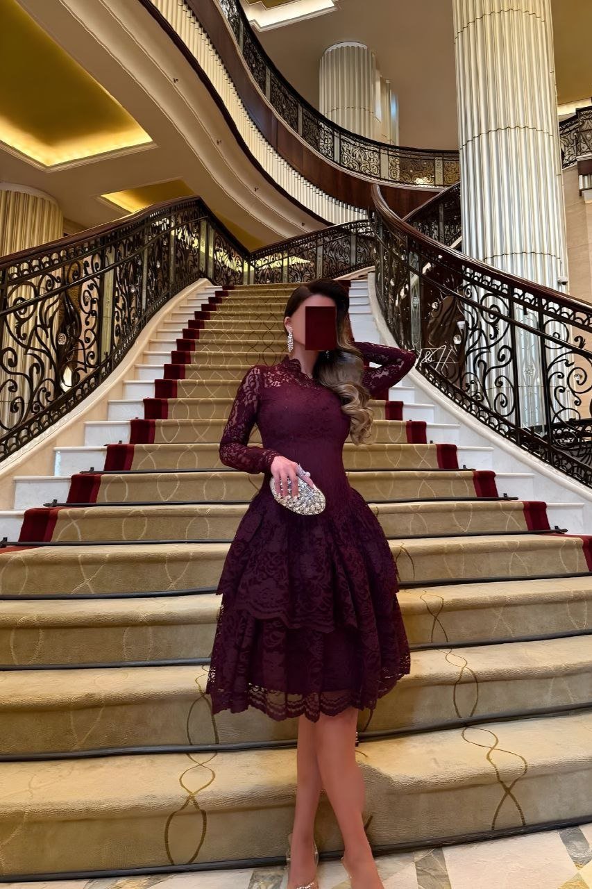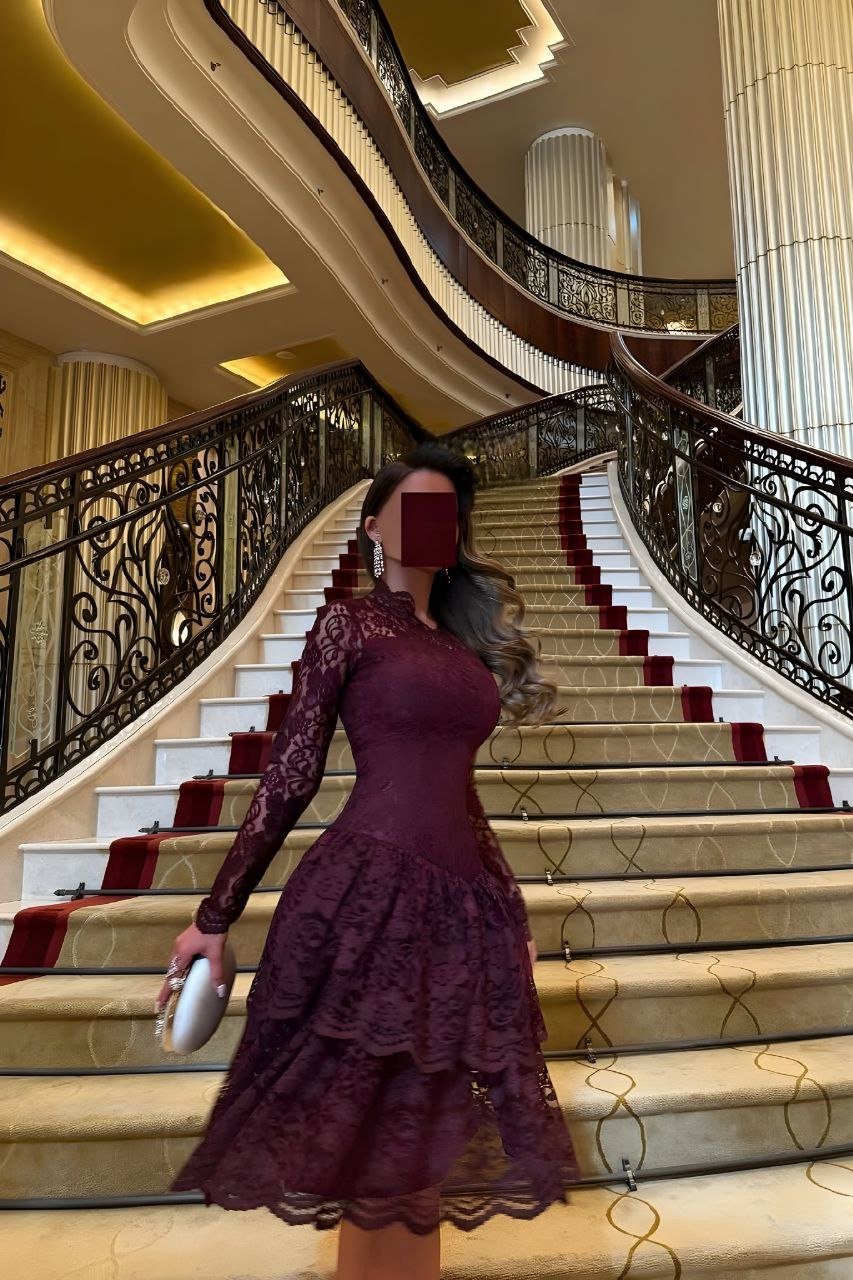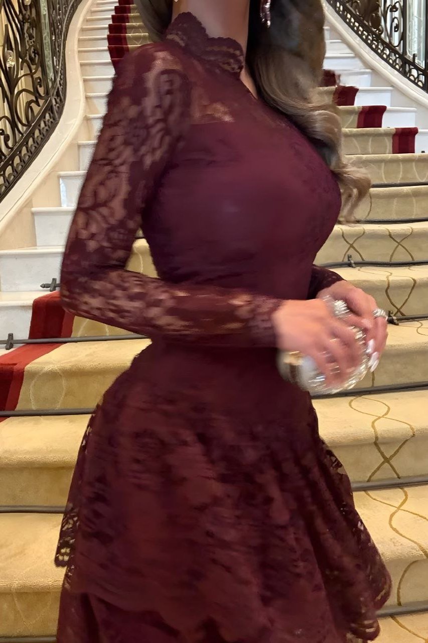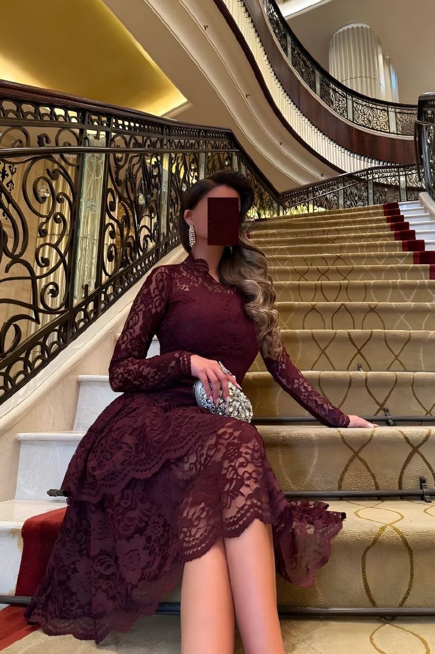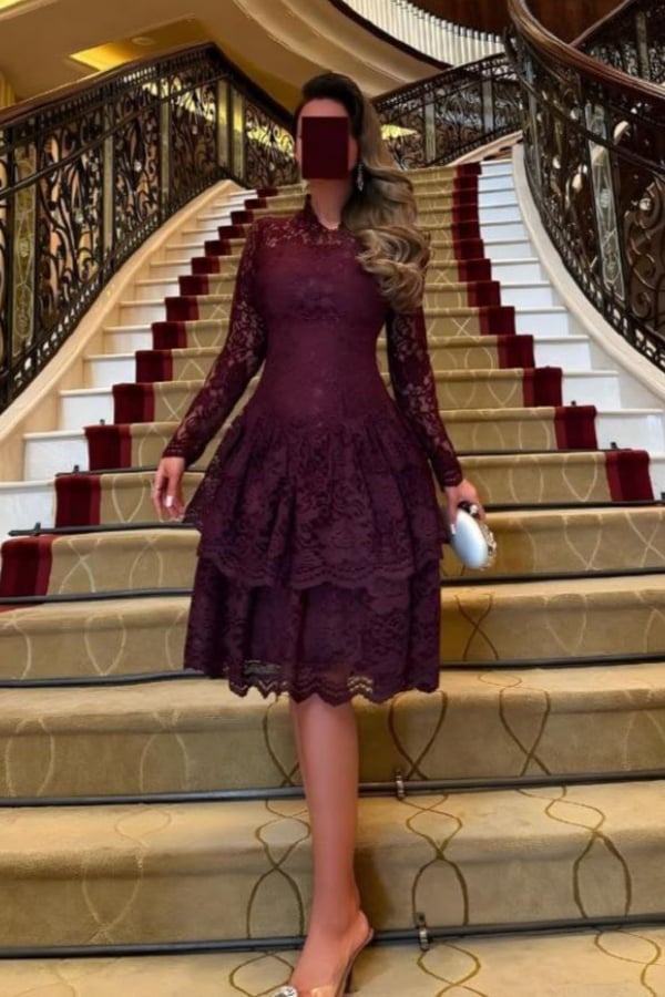 فستان أنثوي بتصميم راقٍ من الدانتيل الفاخر، يتميز بأكمام طويلة تضيف لمسة من الأناقة والرقي. يزينه تصميم الطبقات المتدرجة،