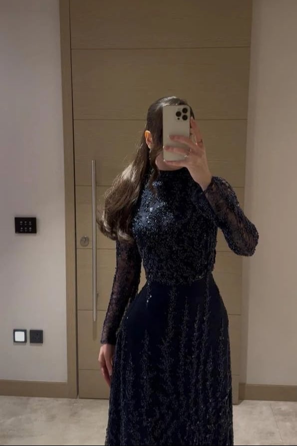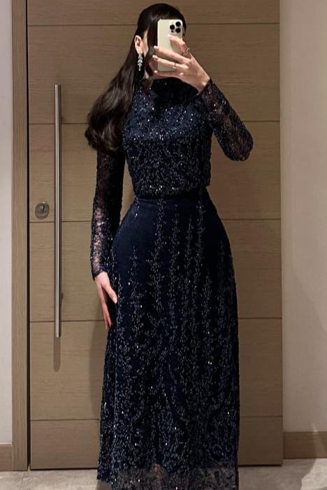 فستان سهرة كحلي مطرز ترتر بأكمام طويلة