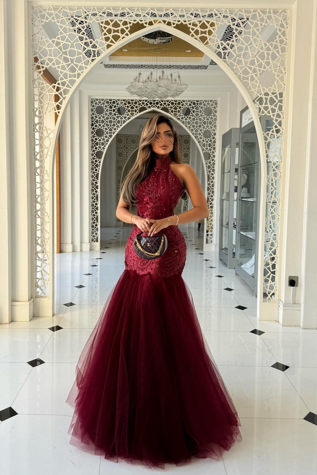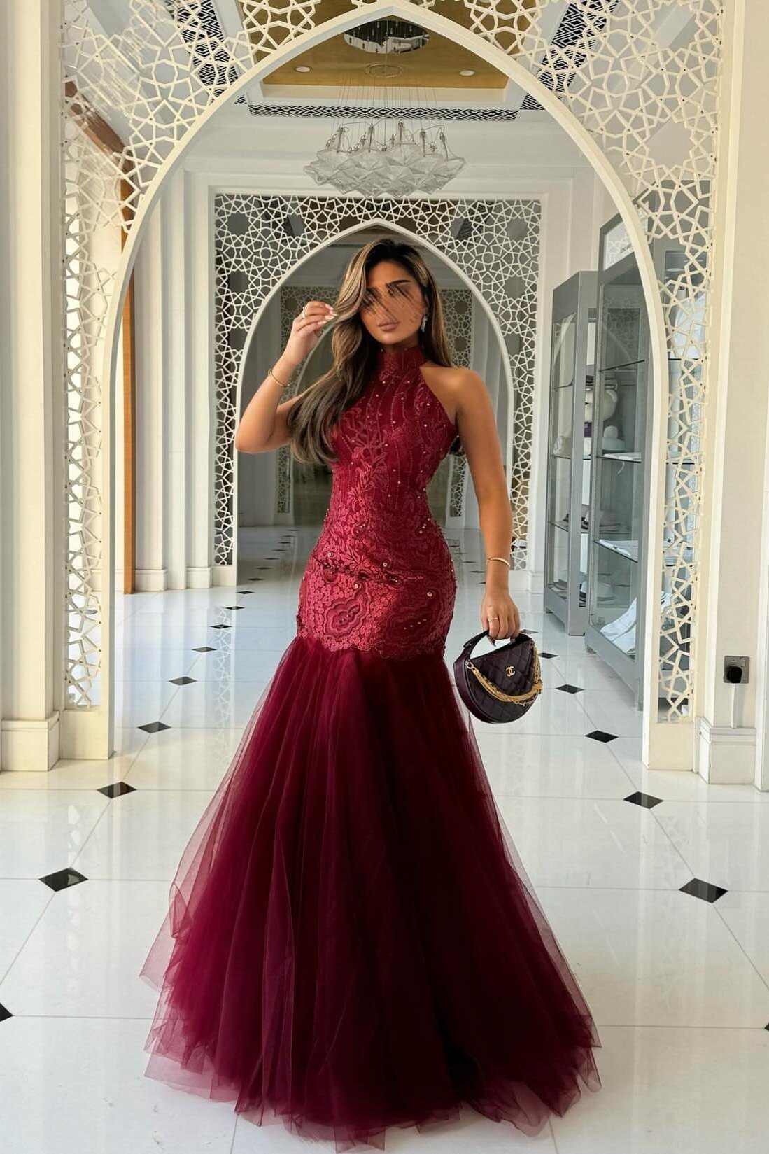 فستان عنابي طويل دانتيل مطرز بقصة حورية البحر