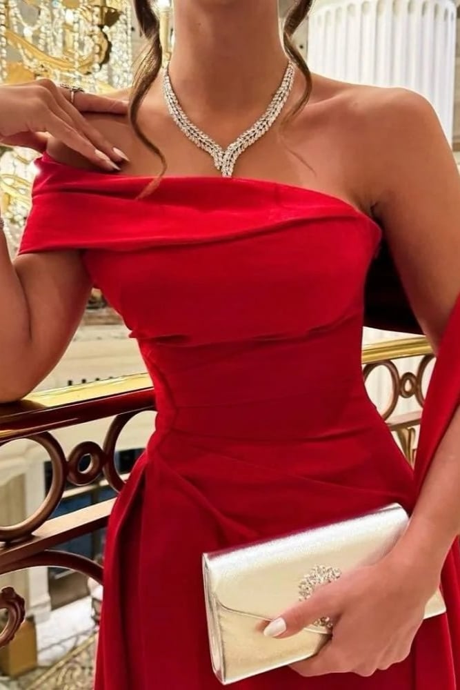 فستان سهرة أحمر أوف شولدر بشق أمامي