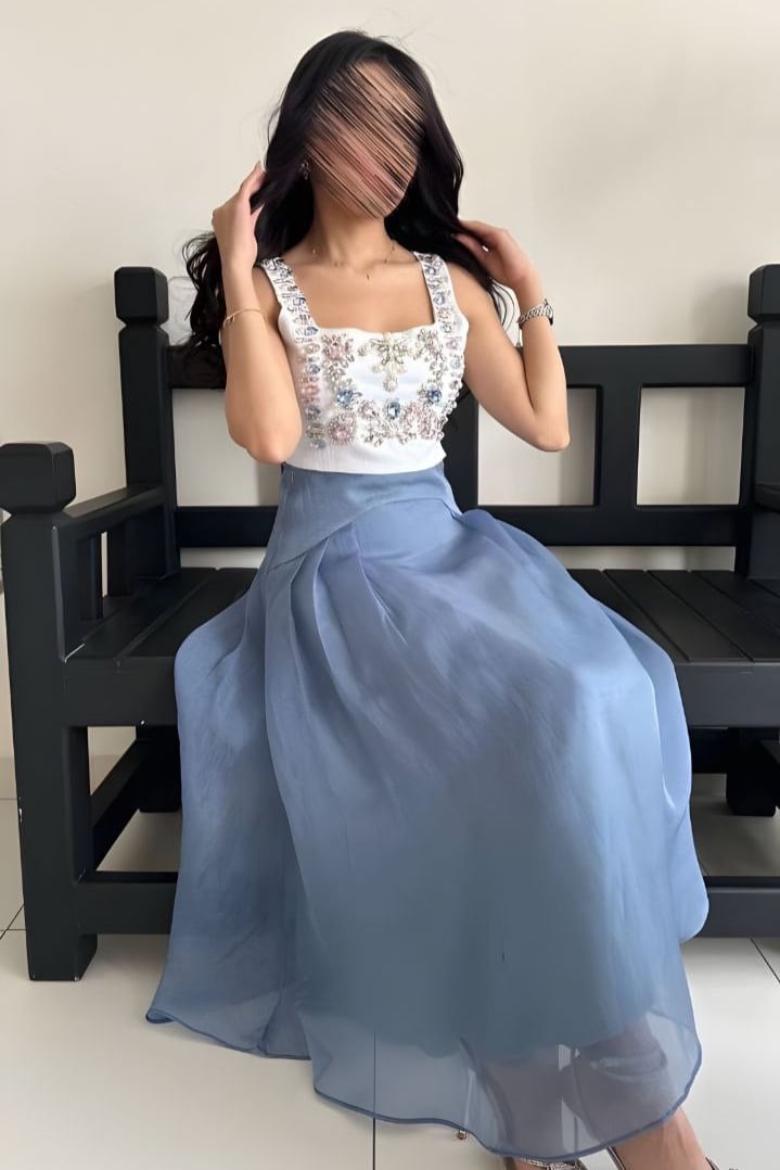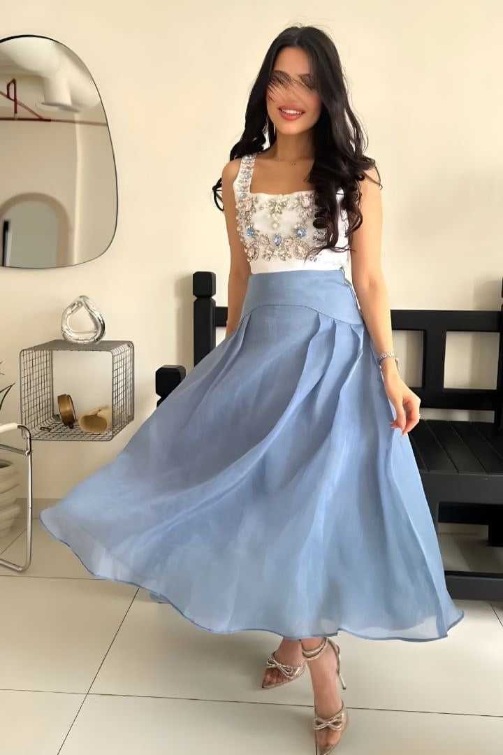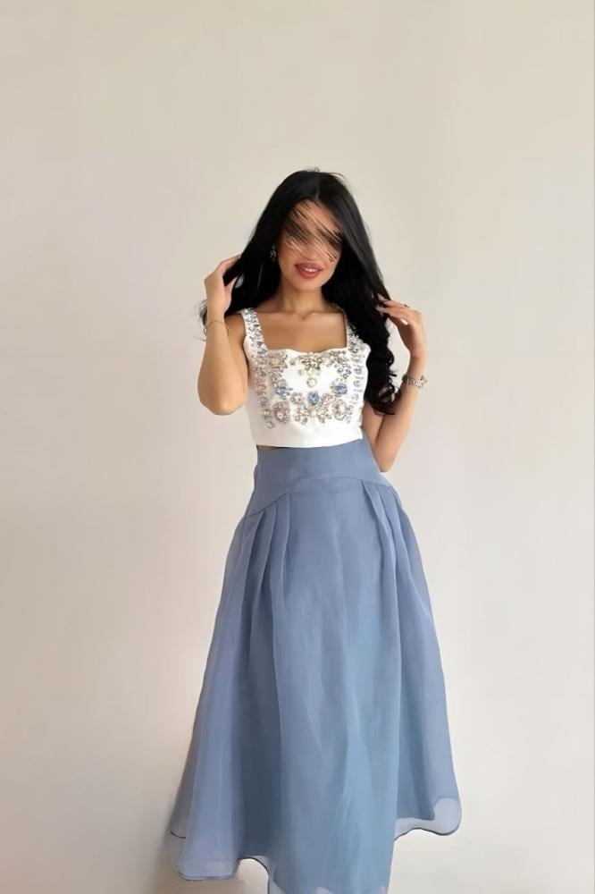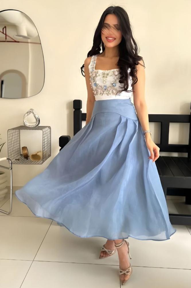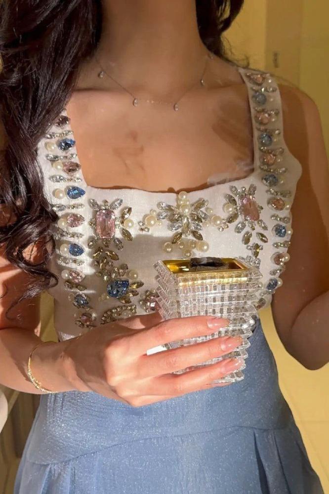 فستان أنيق بتصميم عصري يجمع بين الكورسيه المزخرف بالأحجار اللامعة والتنورة المنفوشة بلون أزرق هادئ.