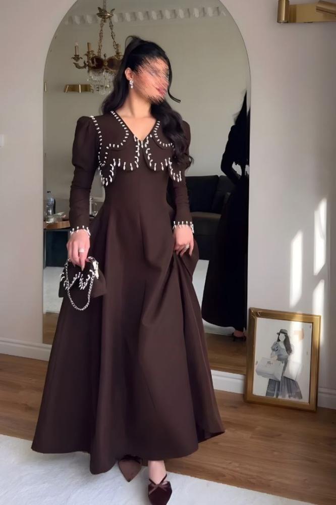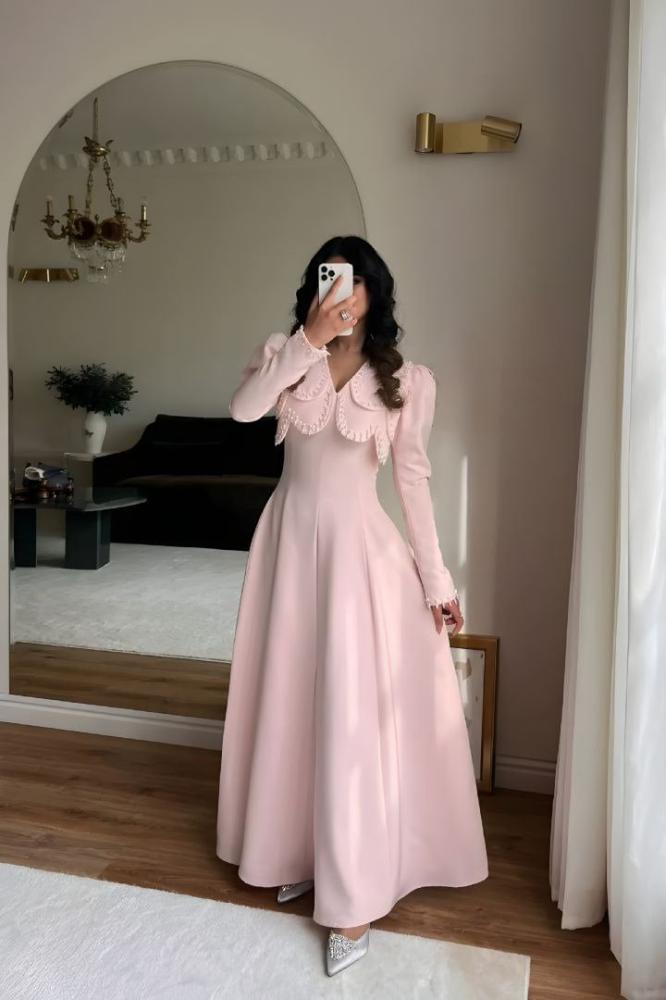 فستان طويل بتصميم أنثوي راقٍ باللون الوردي الفاتح، يتميز بياقة واسعة مزينة بتفاصيل ناعمة تضفي لمسة كلاسيكية مميزة. الأكمام الطويلة بتفاصيل راقية تمنح إطلالة محتشمة وأنيقة. قصة الخصر المحددة والانسيابية الناعمة تجعله مثالياً للمناسبات الخاصة والإطلالات الفاخرة.