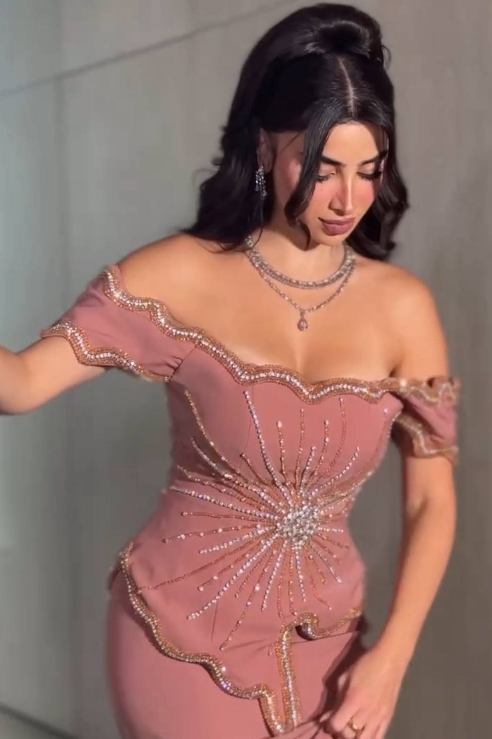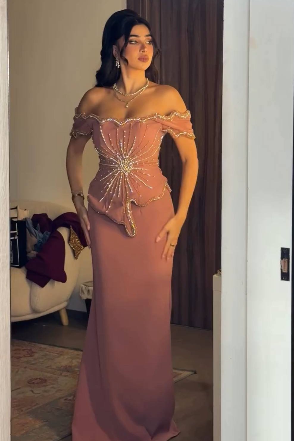 فستان سهرة وردي ترابي أوف شولدر مطرز بالكريستال