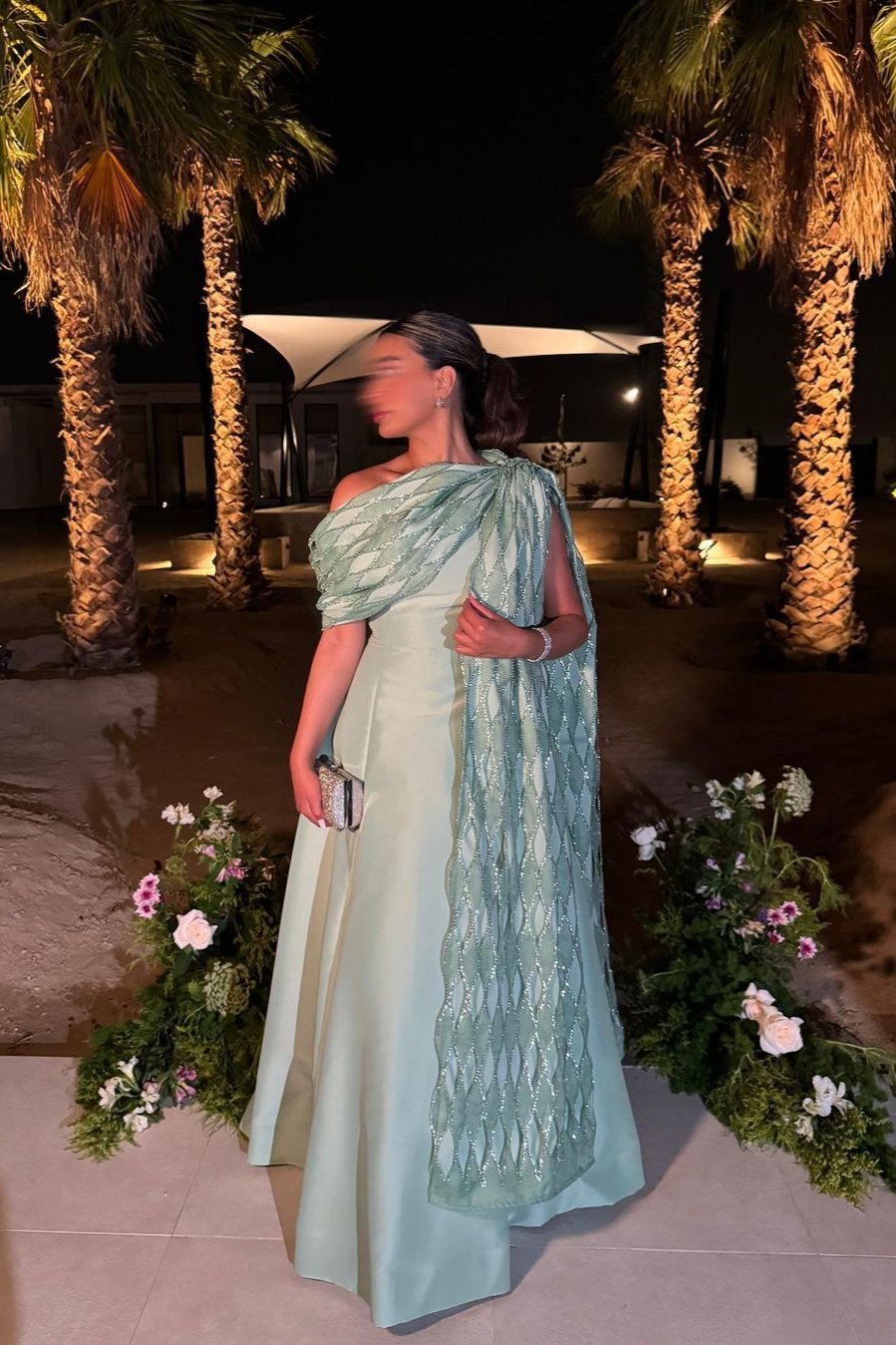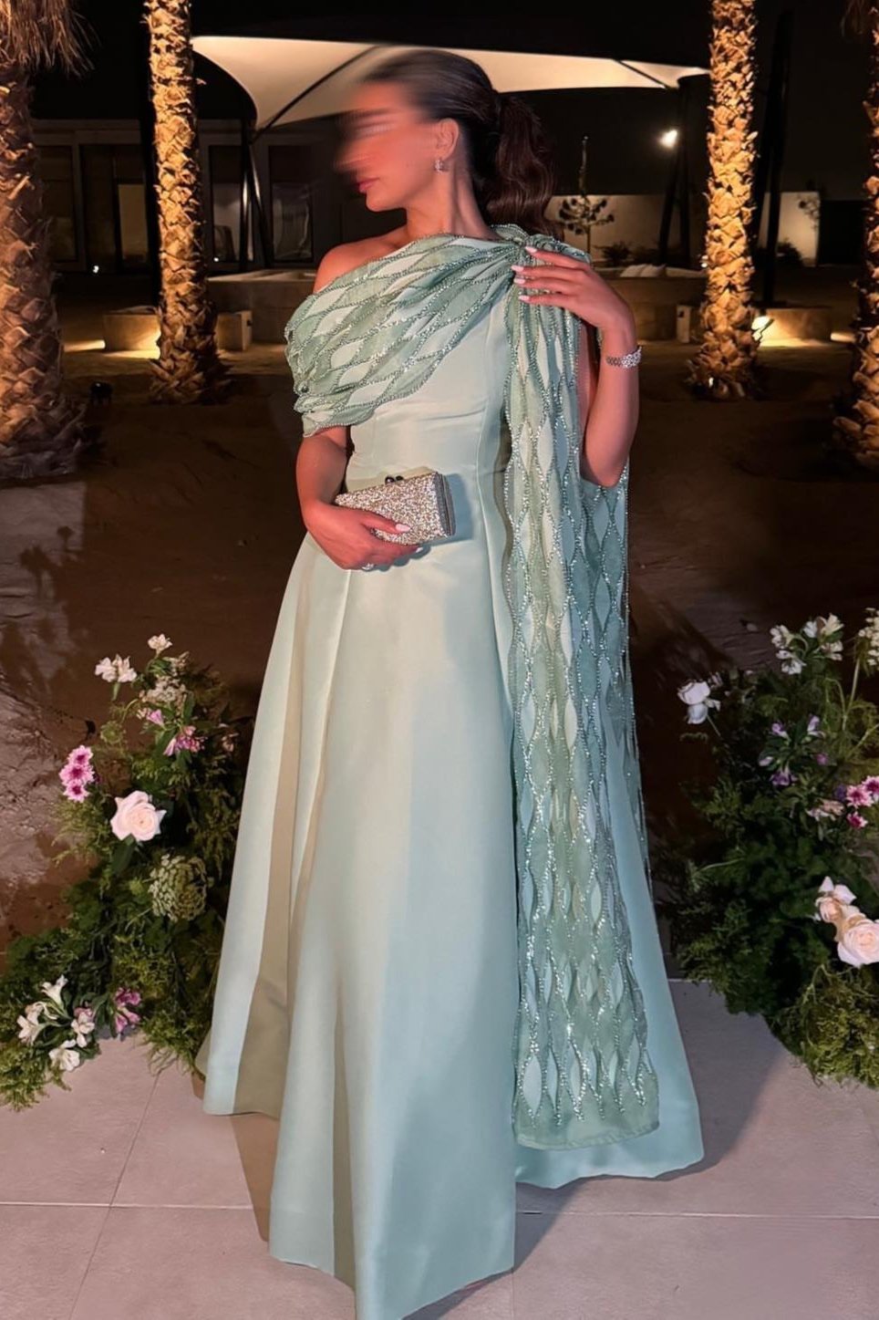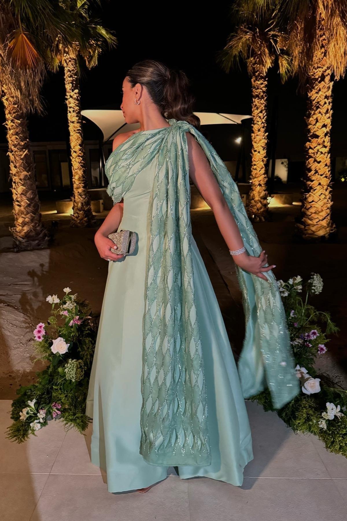 فستان سهرة أخضر طويل كتف واحد مع شال مطرز