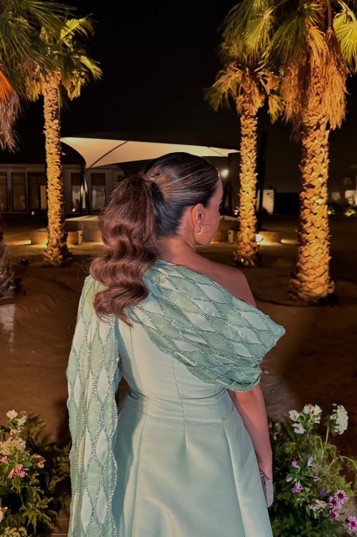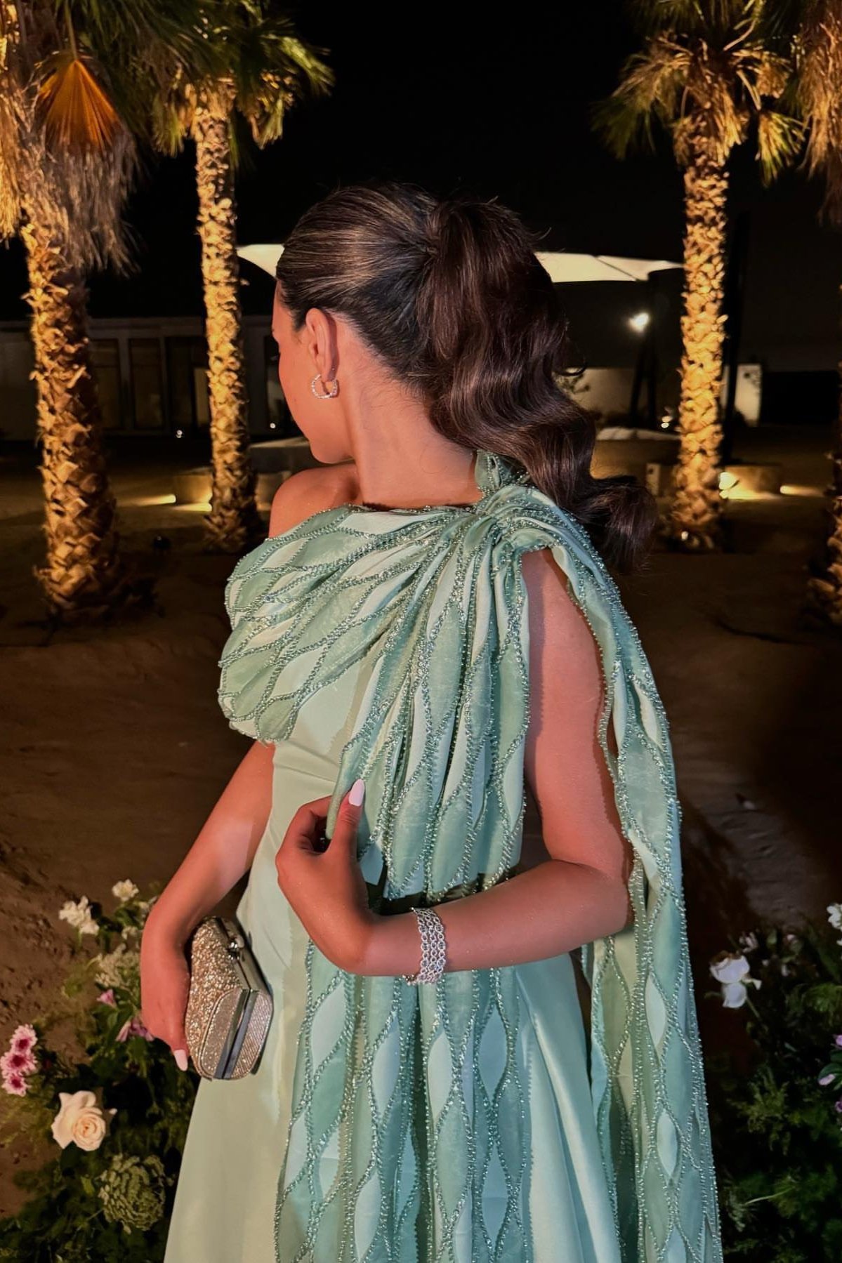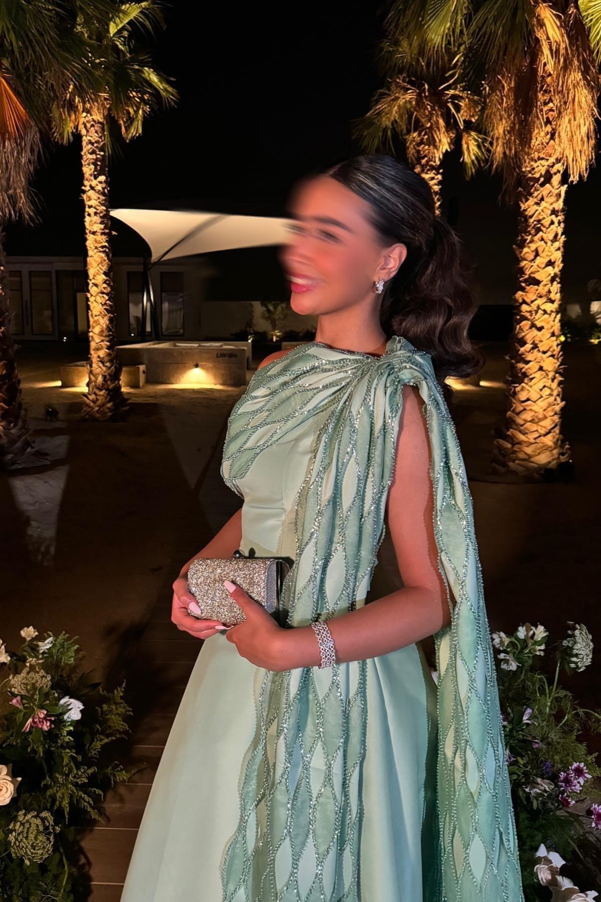 فستان سهرة أخضر طويل كتف واحد مع شال مطرز
