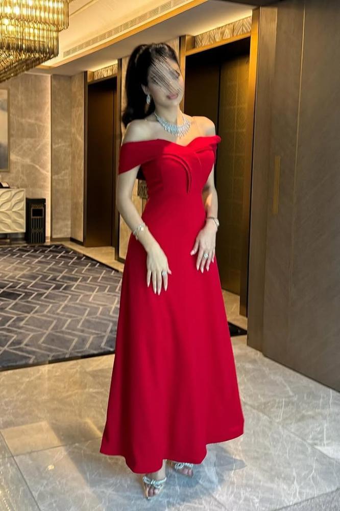 فستان سهرة أنيق بقصة كلاسيكية جذابة، يتميز بأكتاف مكشوفة وتصميم مميز عند الصدر يمنحه لمسة أنثوية راقية.