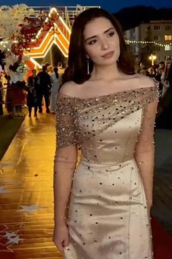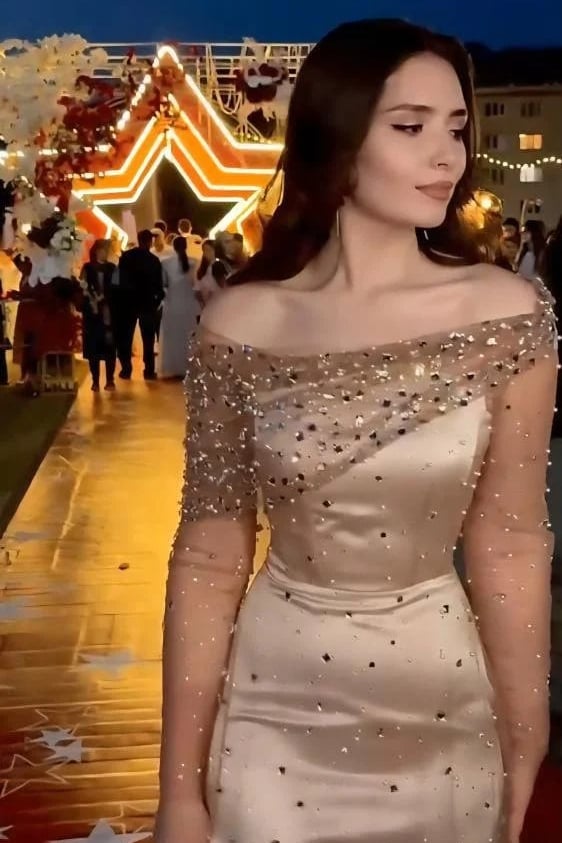 فستان سهرة أوف شولدر بتطريز كريستالي لامع