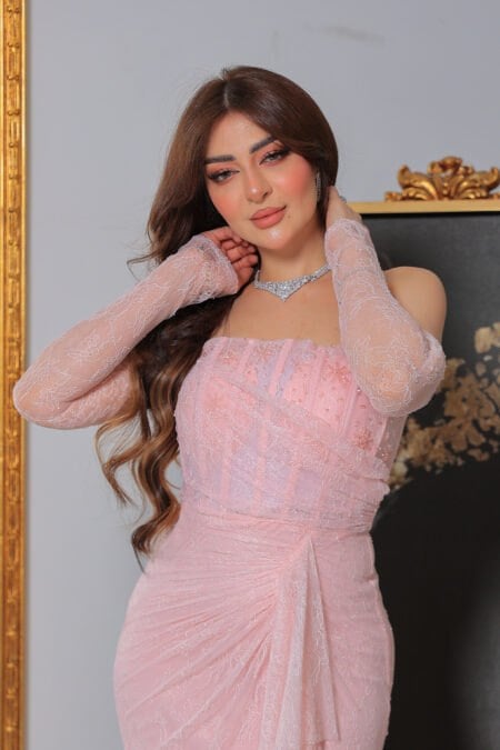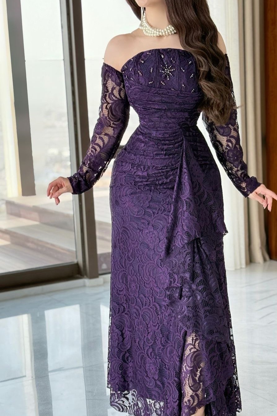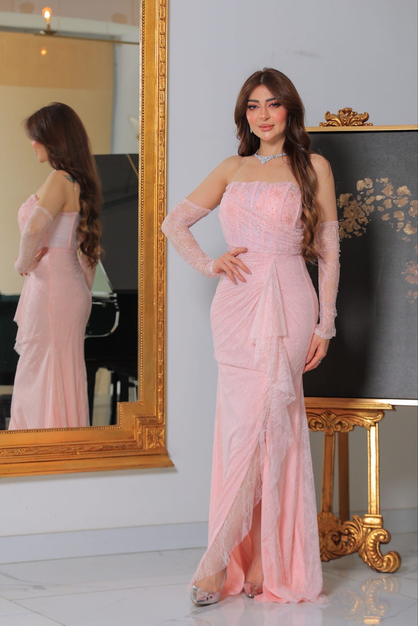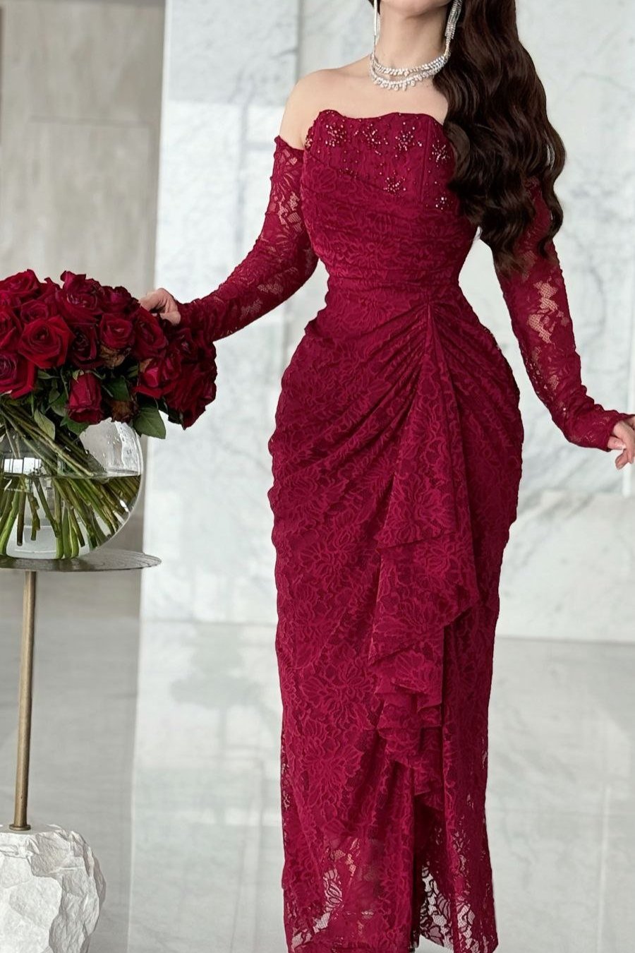 فستان سهرة دانتيل طويل بأكمام منسدلة مطرز بالخرز