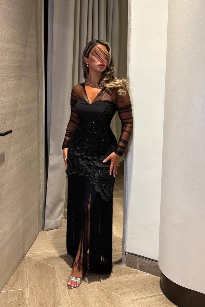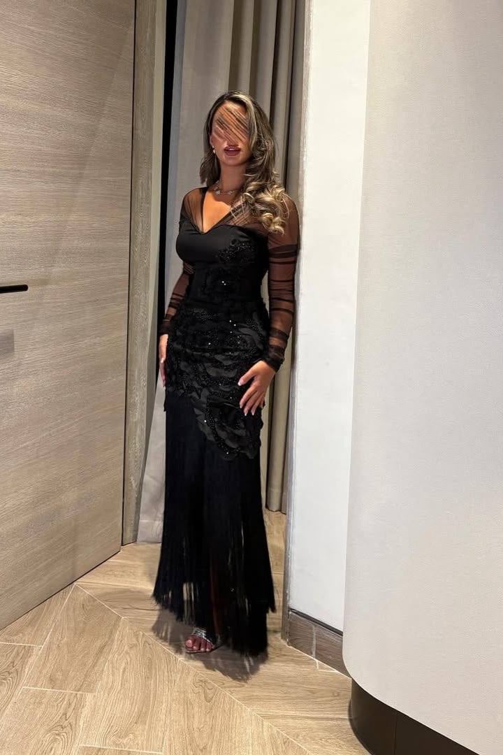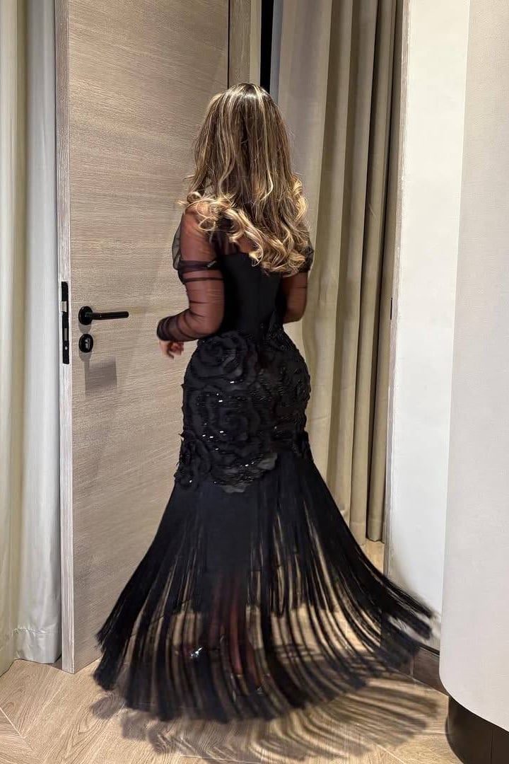 فستان سهرة أسود طويل بأكمام شيفون مطرزة وتطريز ورود